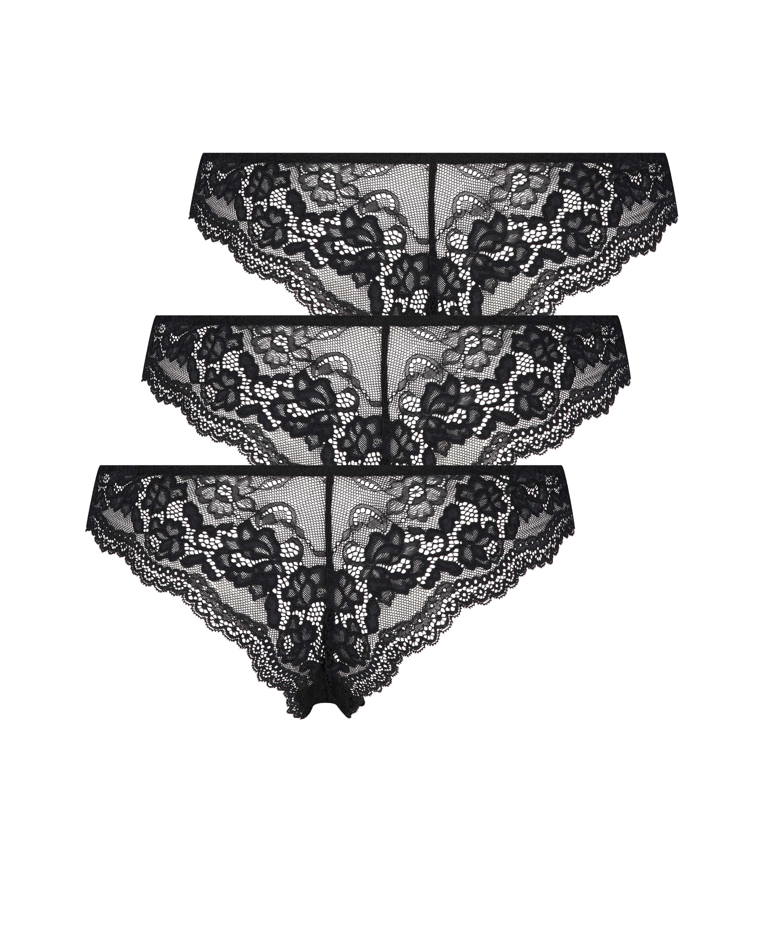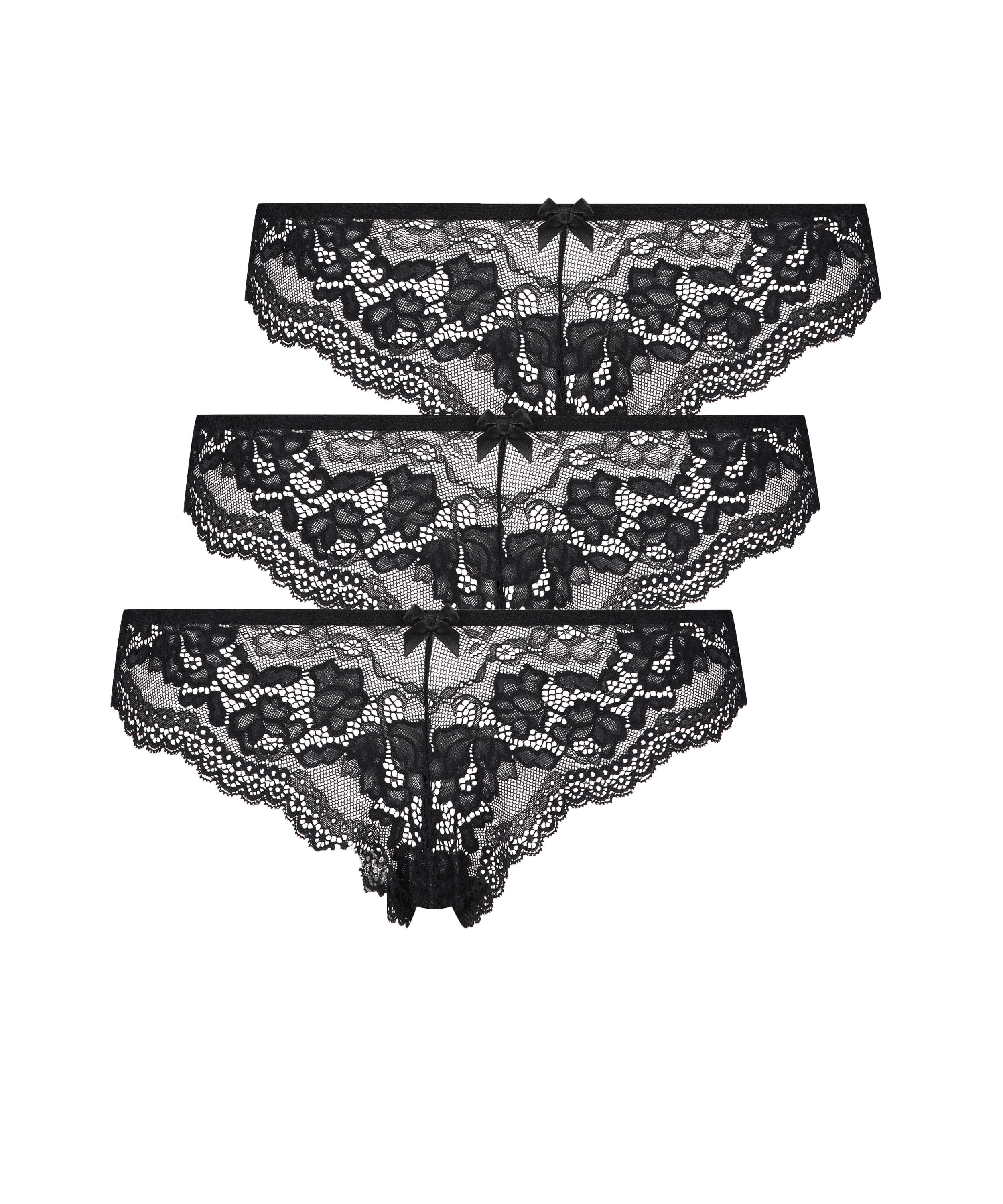 Feel sexy in these Brazilians! They are fully finished with lace and have a small bow on the front as an extra detail. Handy in a 3-pack, so you will look fabulous every day.