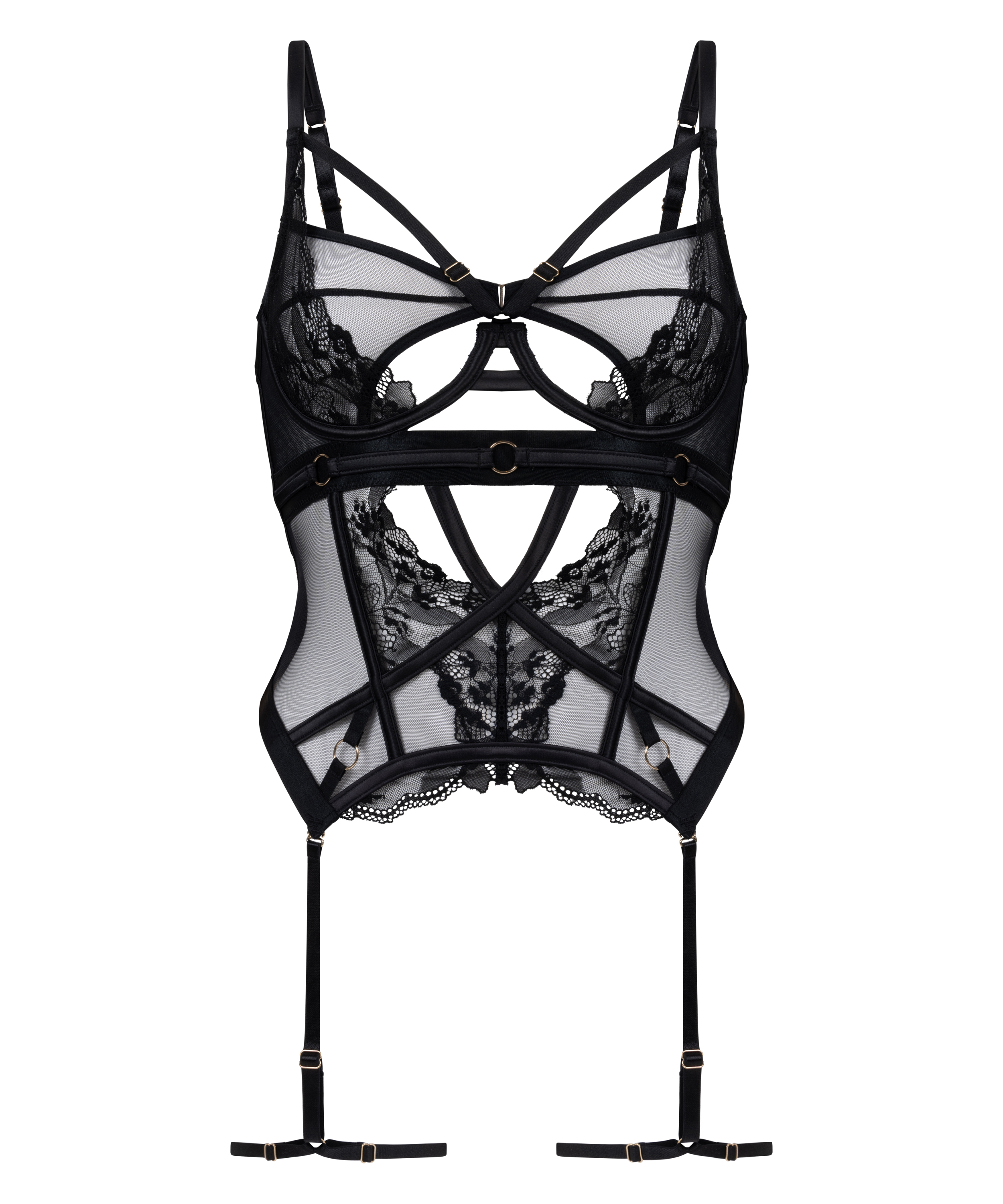 Unleash your confidence with our bustier, a bold and seductive piece that redefines elegance. This stunning design features lace and mesh creating a captivating interplay texture that flatter your figure. The daring cut-out details add a playful edge, making this bustier a true statement.