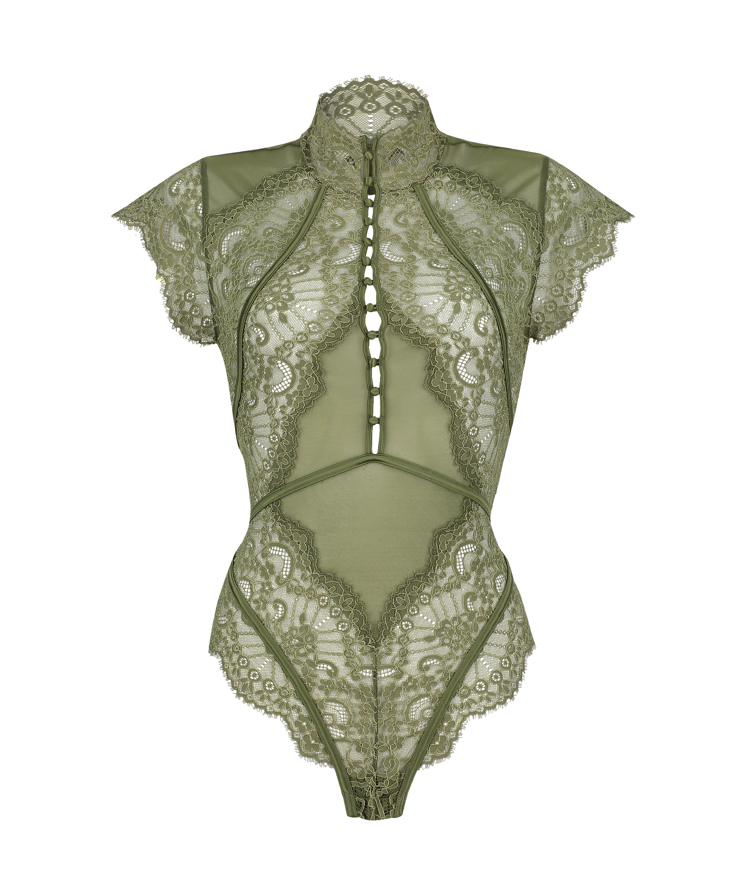 Feel sexy in this fantastically gorgeous body with short sleeves and open back. This body has beautiful button detailing on the front and is made almost entirely of lace.