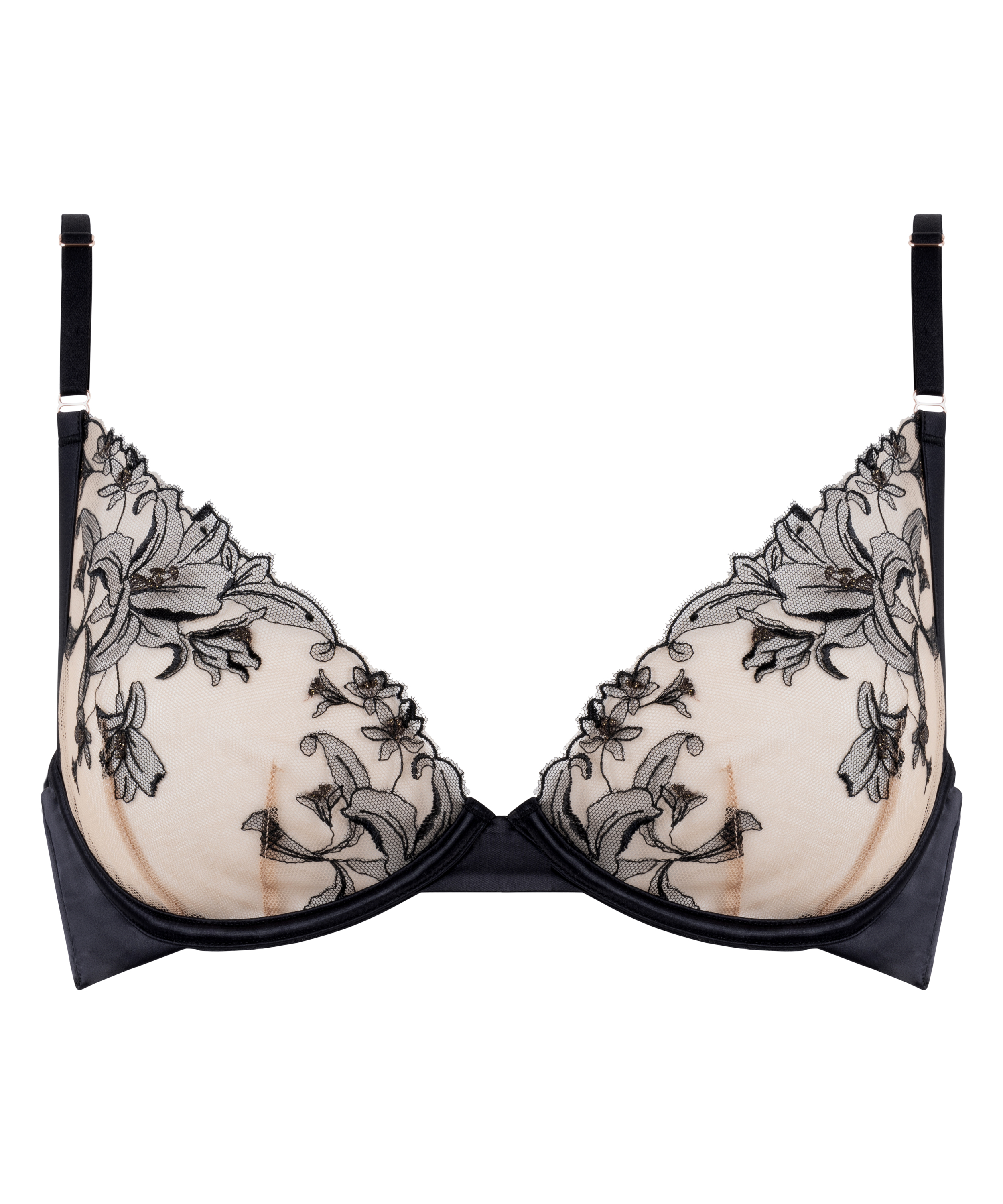 This bra is absolutely gorgeous! This non-padded bra is underwired and has adjustable shoulder straps. It's made of beautiful lace material which creates a romantic semi-transparent look. Combine with the matching knickers. Part of our Noir collection.