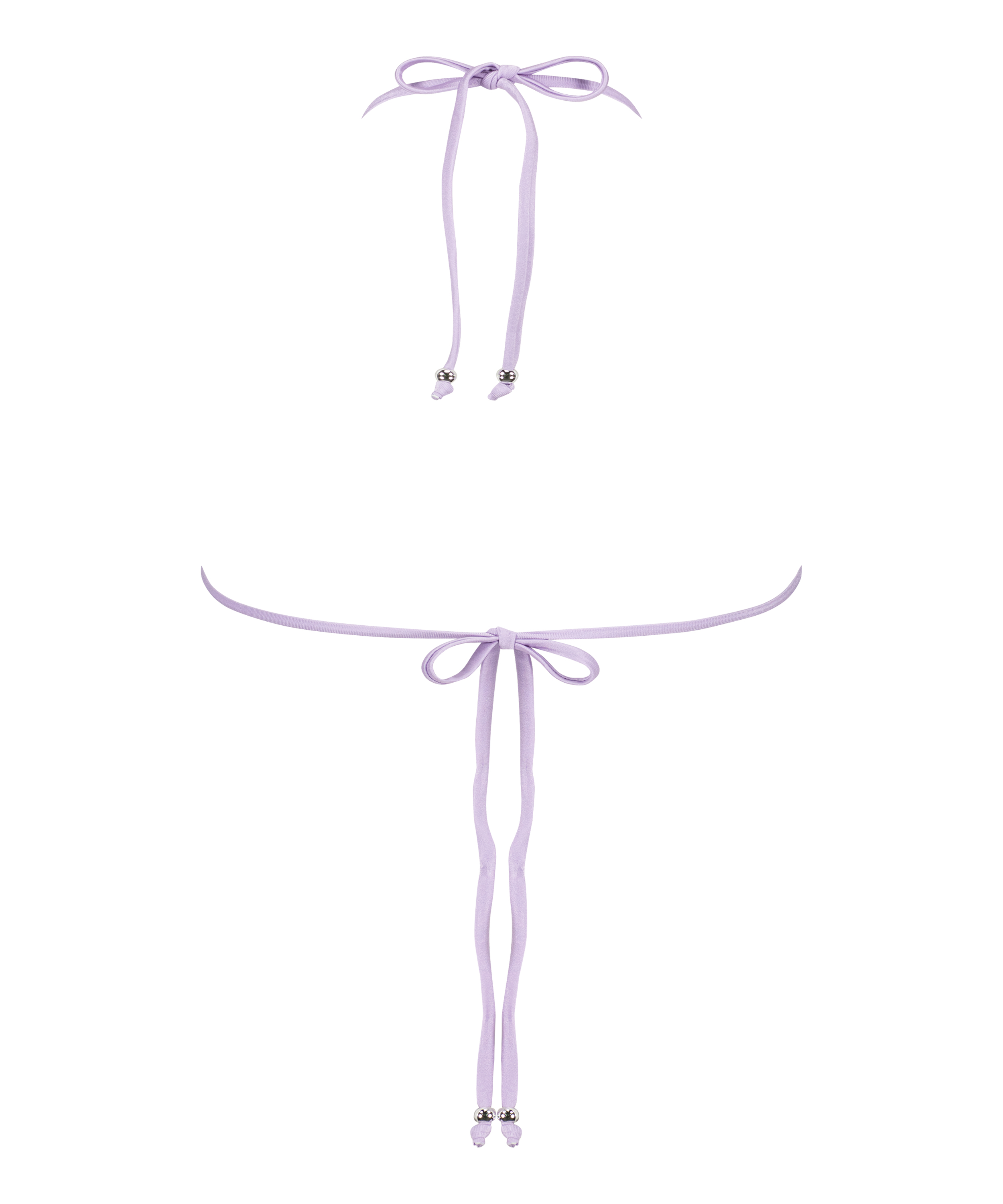 Show off at the beach with this slick triangle bikini! With removable padded cups to fit your every need. There is a back and neck string closure with hardware. In between the cups there is a ring decoration. Find the matching bottom to complete the set!