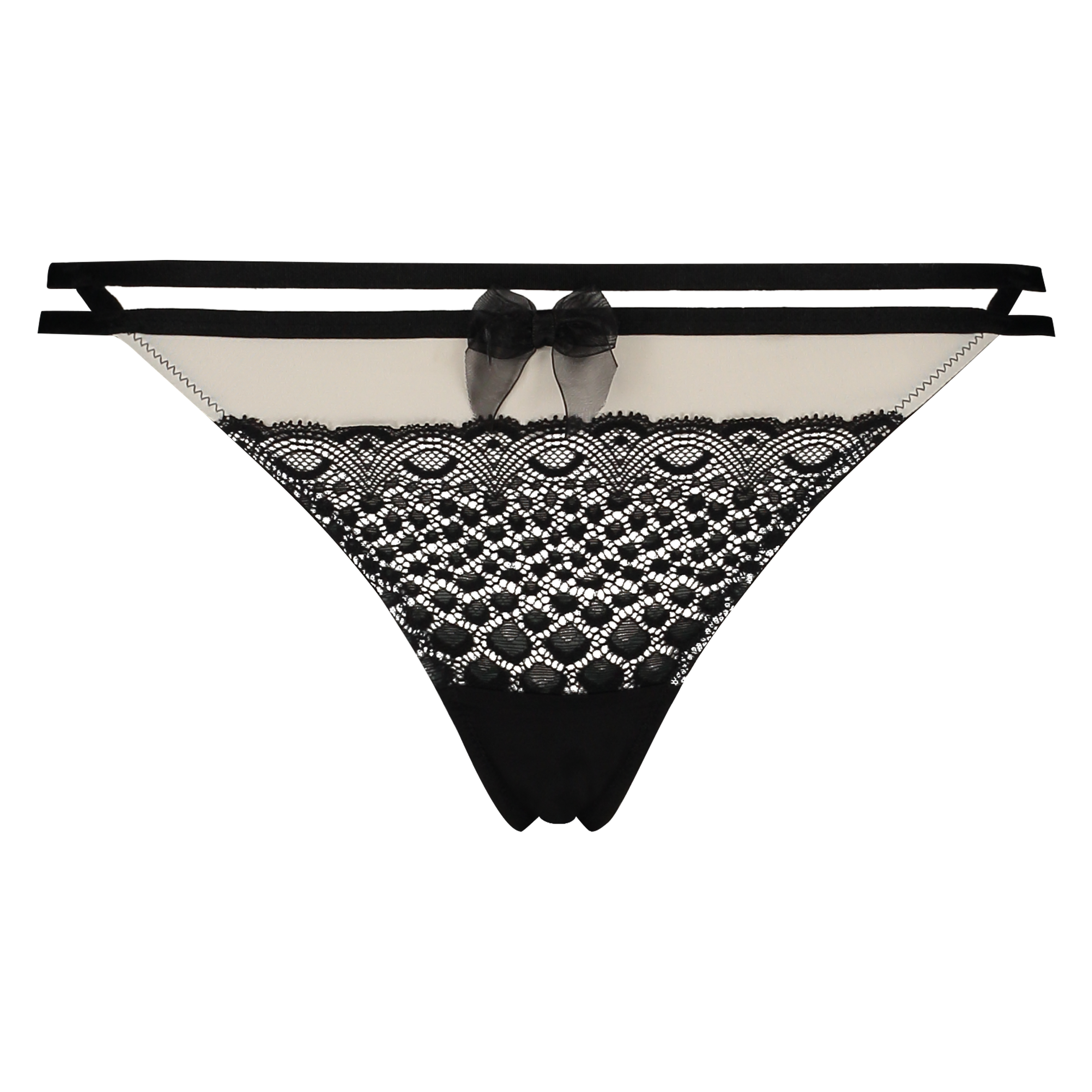 This thong will complete your set. It features semi-transparent lace and strapping details. The small bow on the front adds a finishing touch. Combine with the matching bra for a complete set.