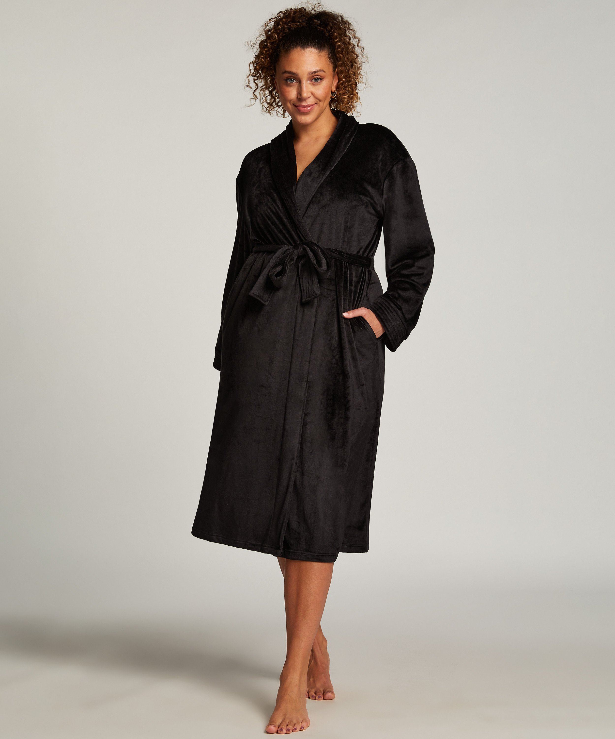 This lovely soft bathrobe reaches to below the knees and has a tie sash and side pockets.