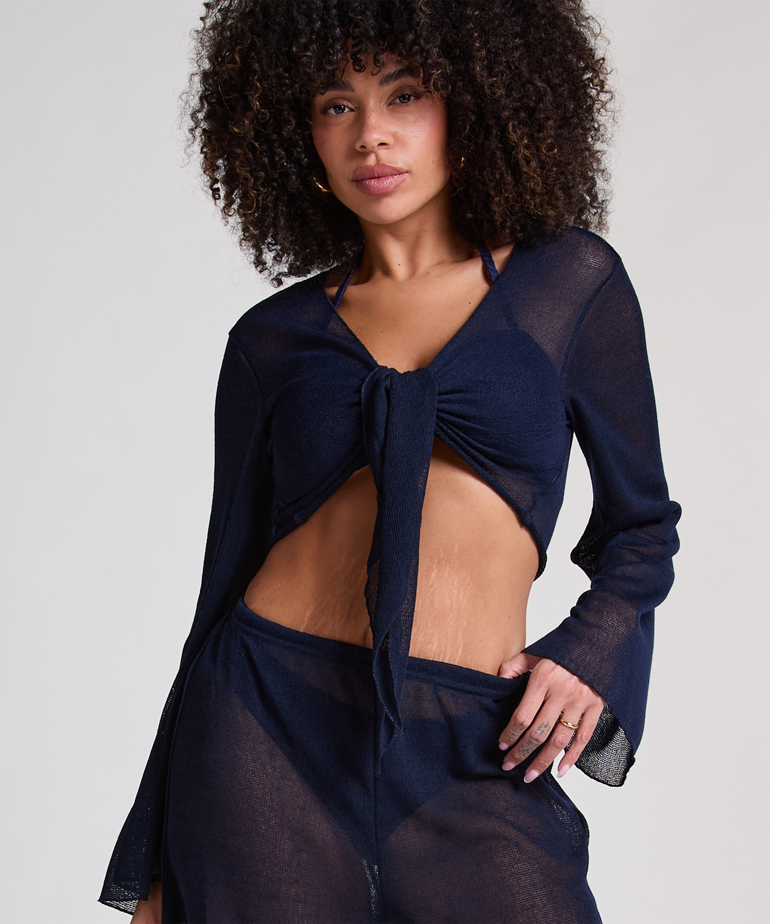 Embrace effortless beach style with this knitted top. Featuring a lightweight open-knit design, this top is perfect for layering over swimwear. The real tie closure at the front allows for an adjustable fit, while the cropped silhouette adds a trendy vibe. Combine with your favorite bikini for a complete look.