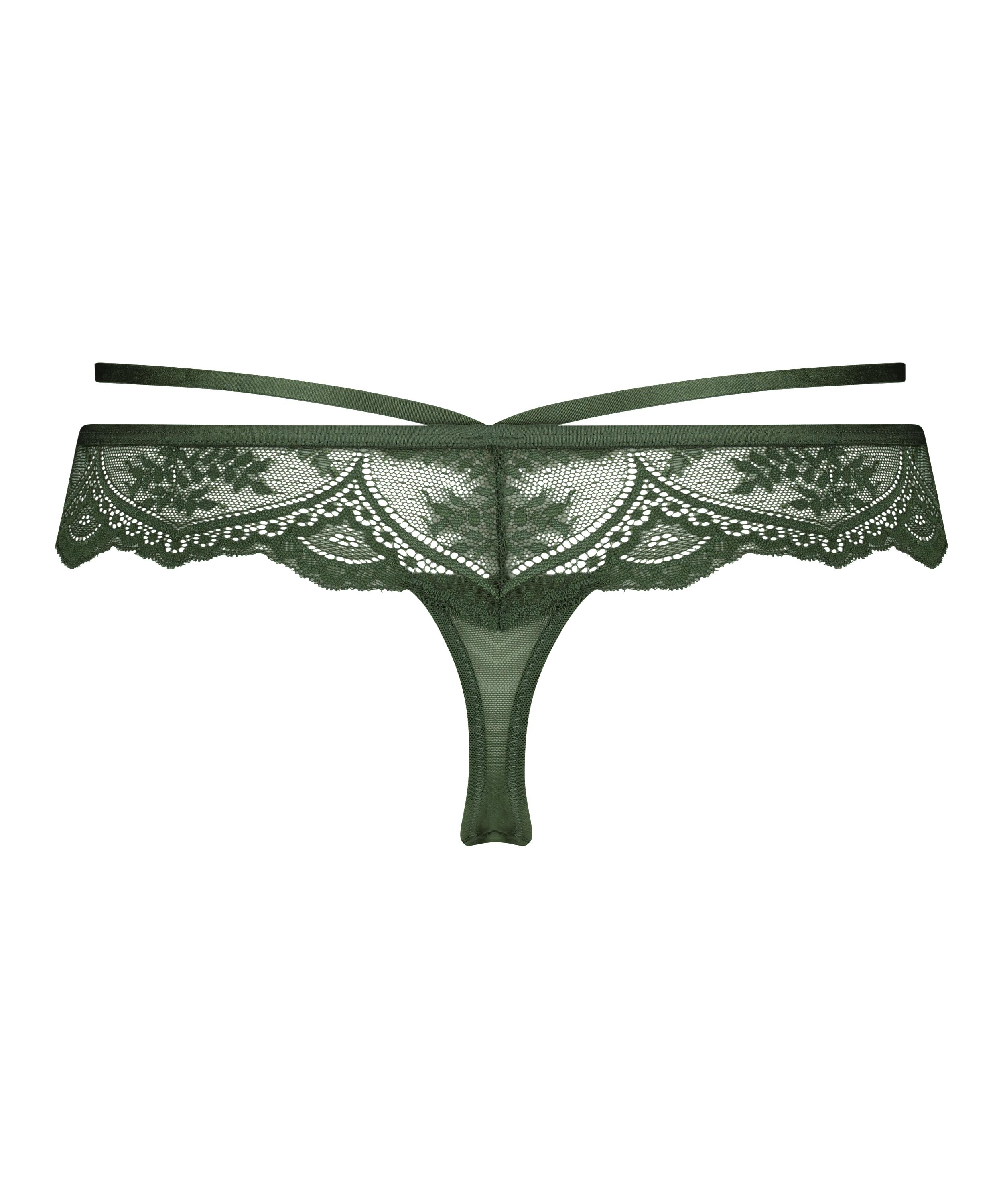 These gorgeous knickers are pretty much all luscious lace. The thong has a bow on the front and strappy details. Combine with a matching bra or bralette for a pretty set.