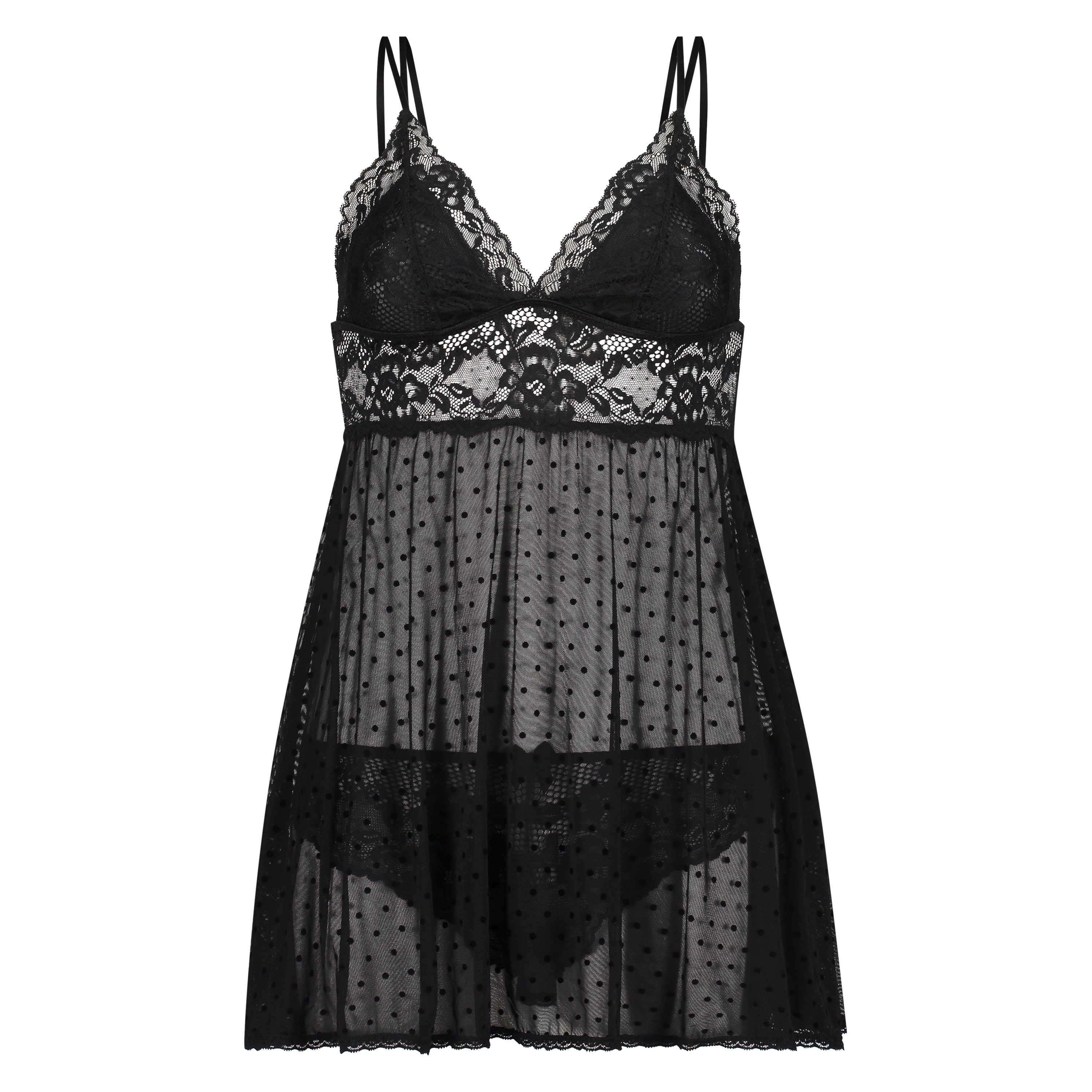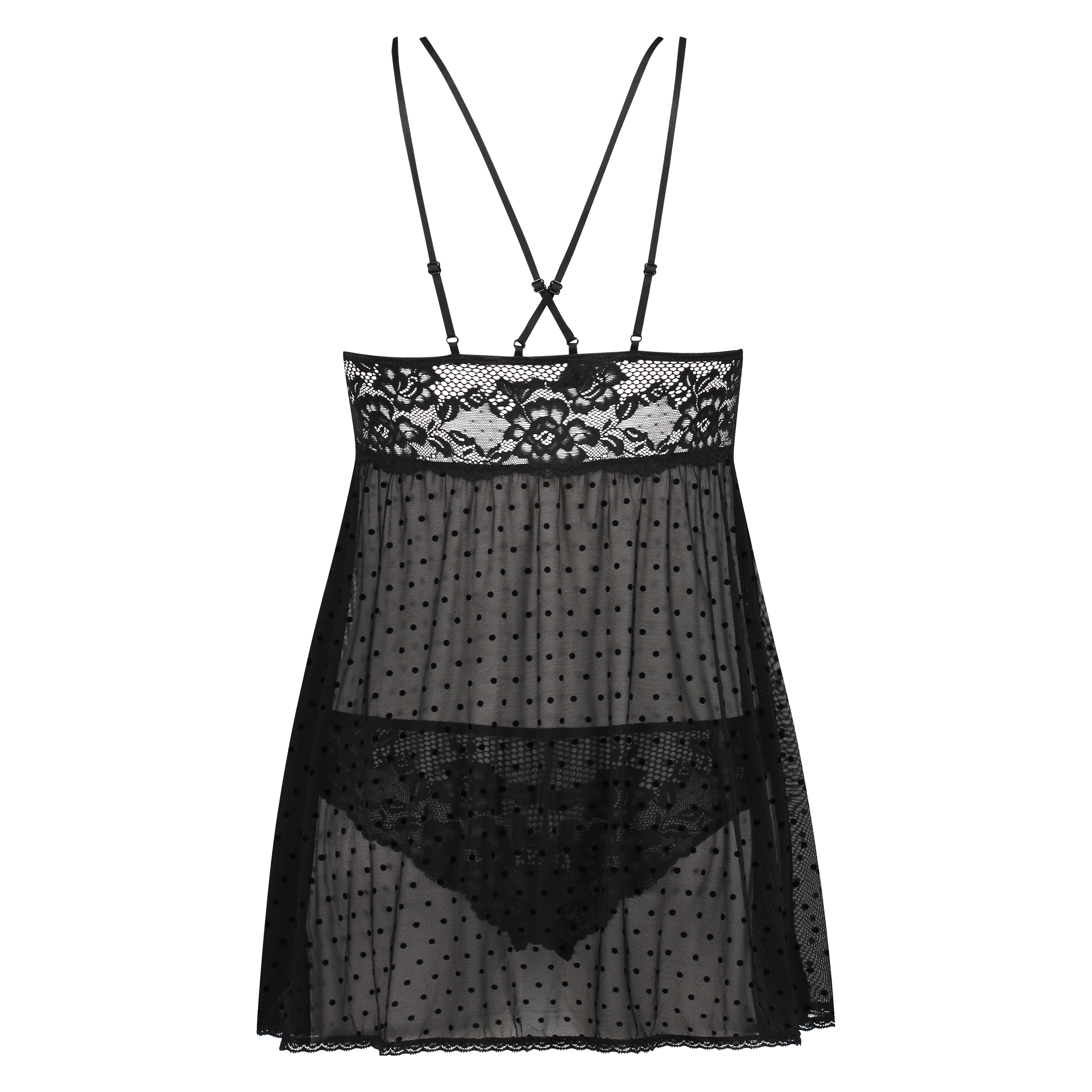 Feel sexy in this non-wired babydoll! The babydoll has lace and mesh detailing, adjustable straps and is finished in a polka dot pattern. The matching knickers are made of a mix of lace and mesh.