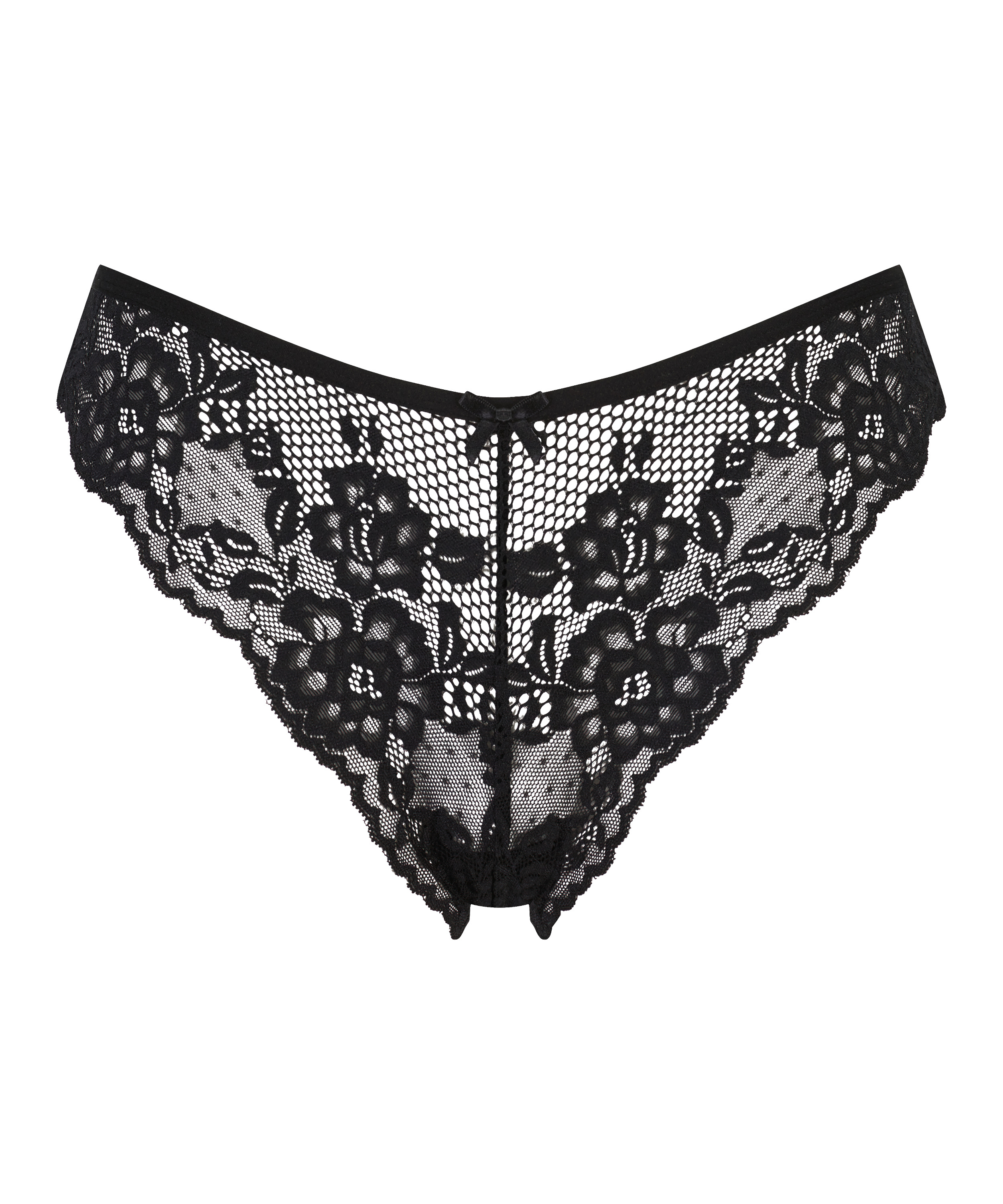 These semi-transparent Brazilian knickers are finished with lots of lace. The small bow on the front adds a finishing touch.