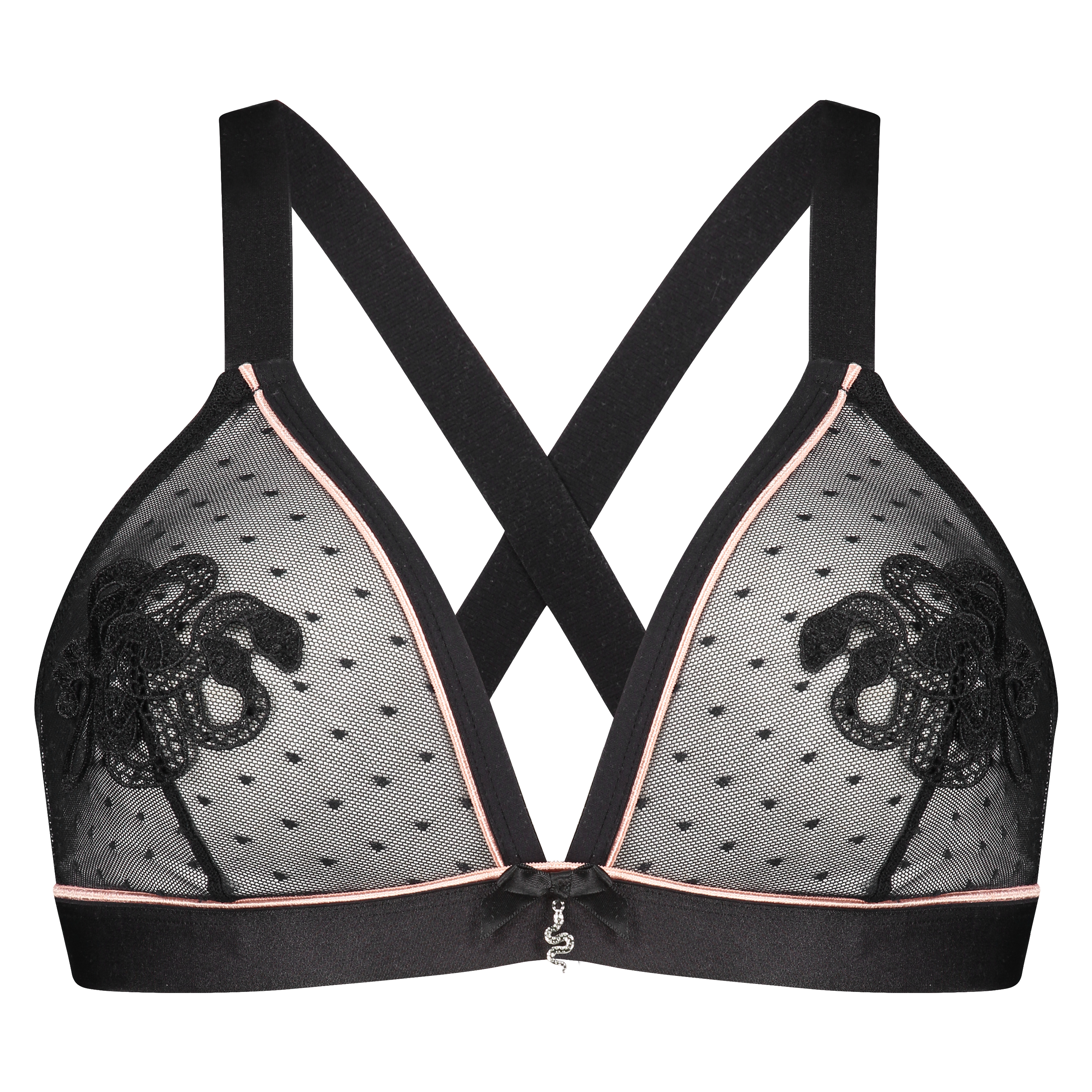 Feel super sexy with this non-padded bralette! This sexy mesh bralette is finished with a snake on the cup. Combine with the matching bottoms. Part of the I AM collection.