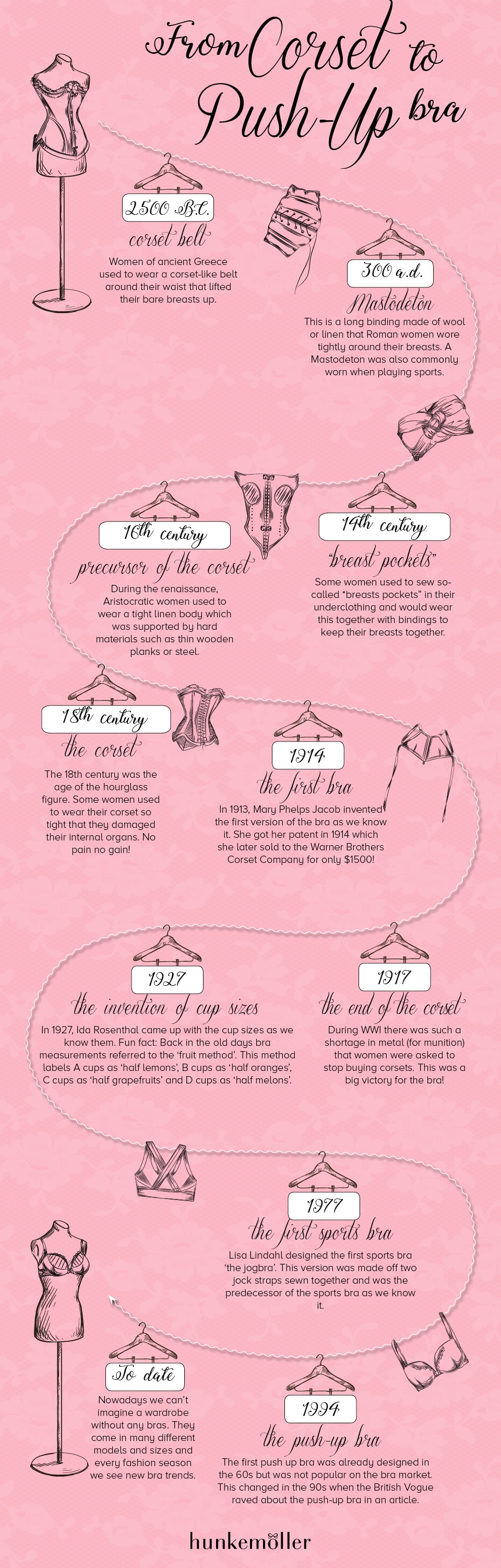 Nowadays we know so many different kinds of bras. From push-up bras to bralettes, bras with or without underwire, you name it! We wear bras for comfort and support but also because its part of our everyday wardrobe and a fashion item. But did you know that the bra as we know it does not even exist that long yet? The first modern bra was designed in the late 19th century and became a world wide hit in the 20th century. In 2014 the bra existed for only a 100 years! We have therefore created this fun infographic with interesting facts about the evolution of the bra.