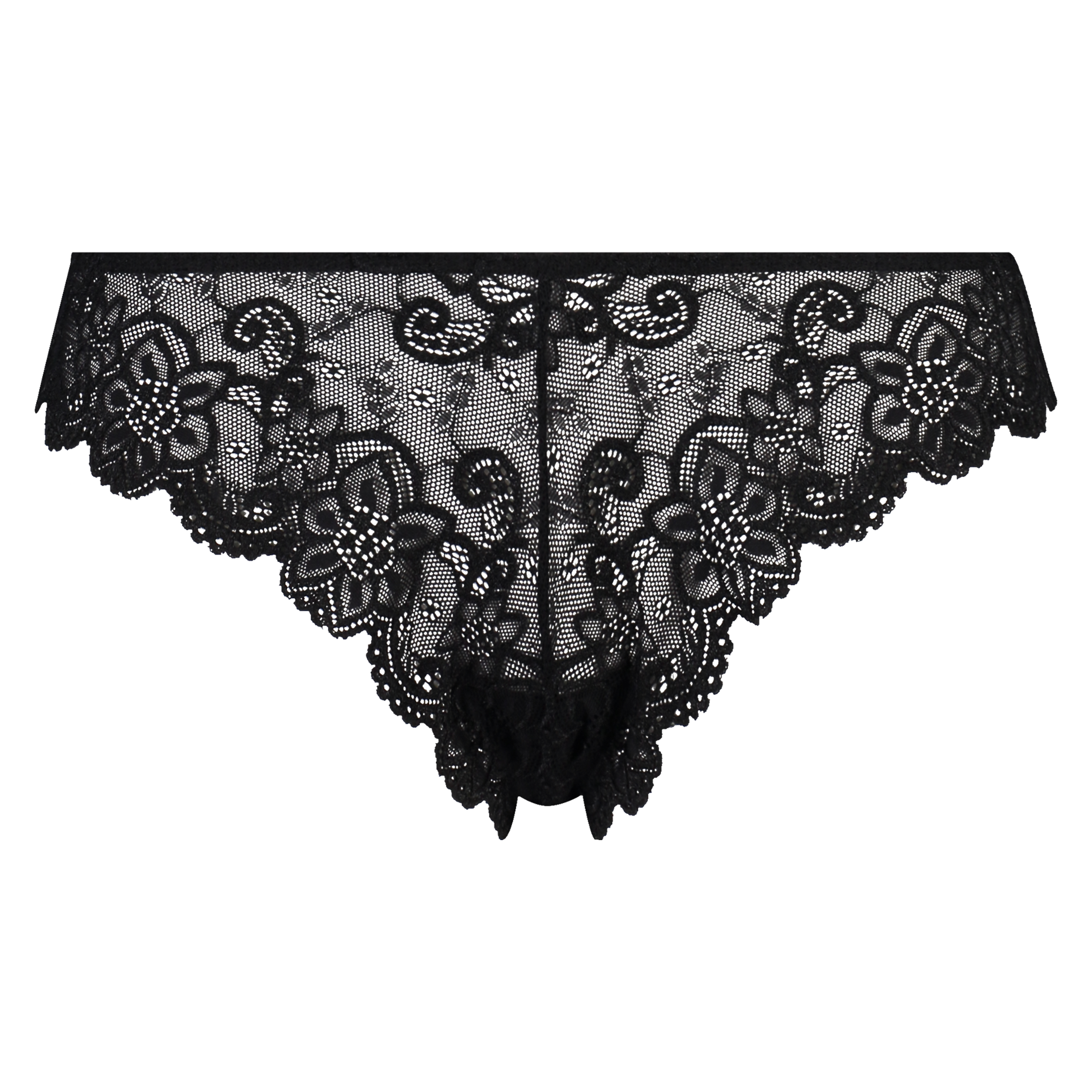 These Brazilian knickers are made from semi-transparent lace with a floral pattern. The flowers in the pattern are accented with a black edge.
