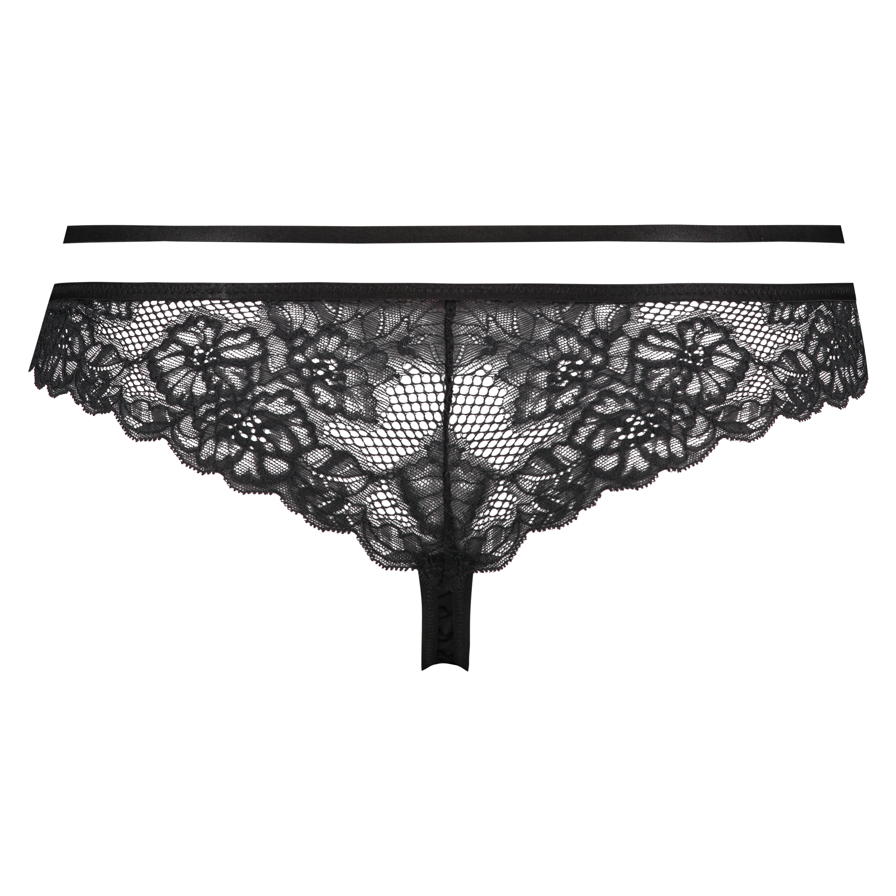 These Brazilian knickers feature semi-transparent mesh on the front with a nice pattern. The back is lace. The extra straps add the finishing touch.