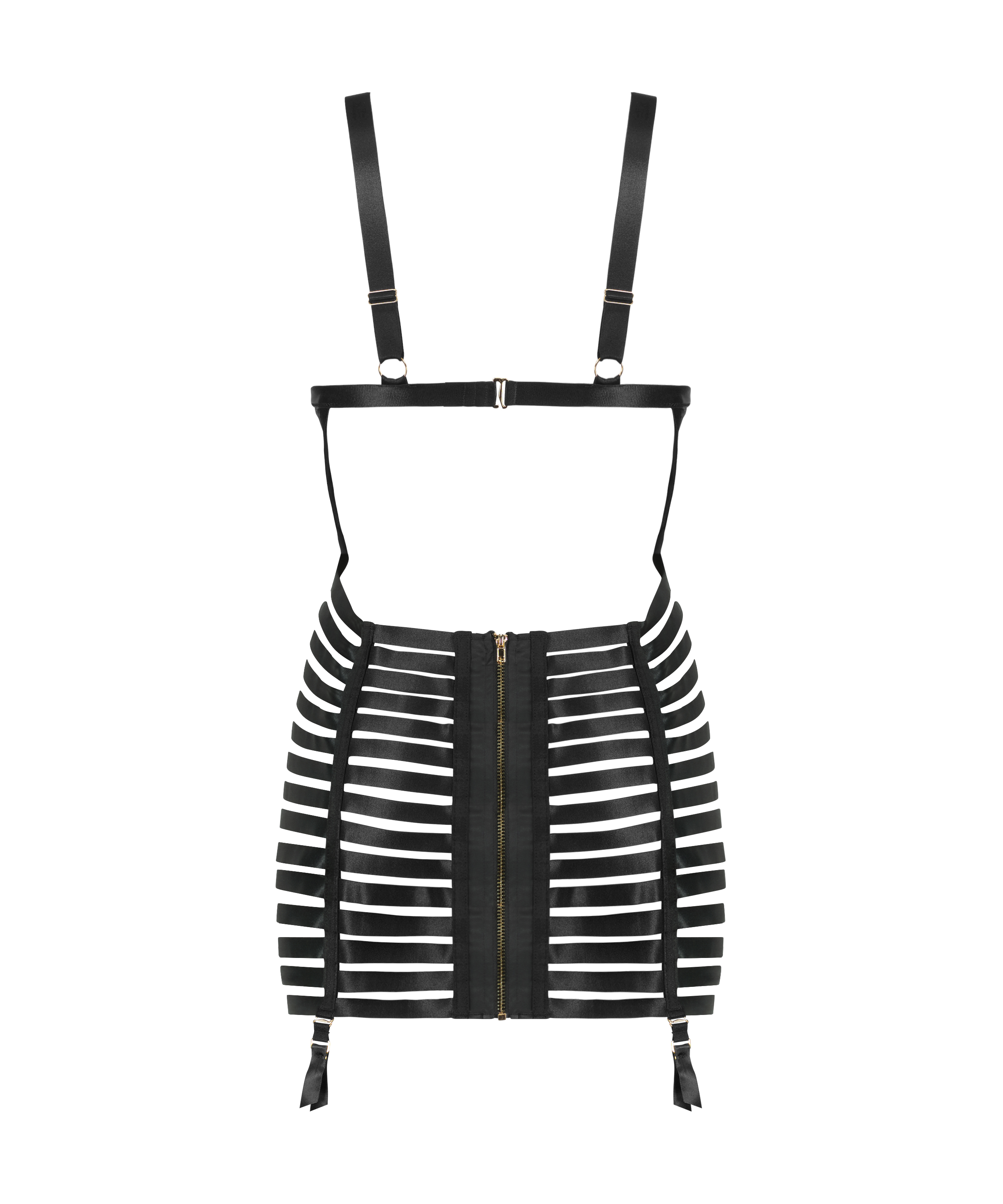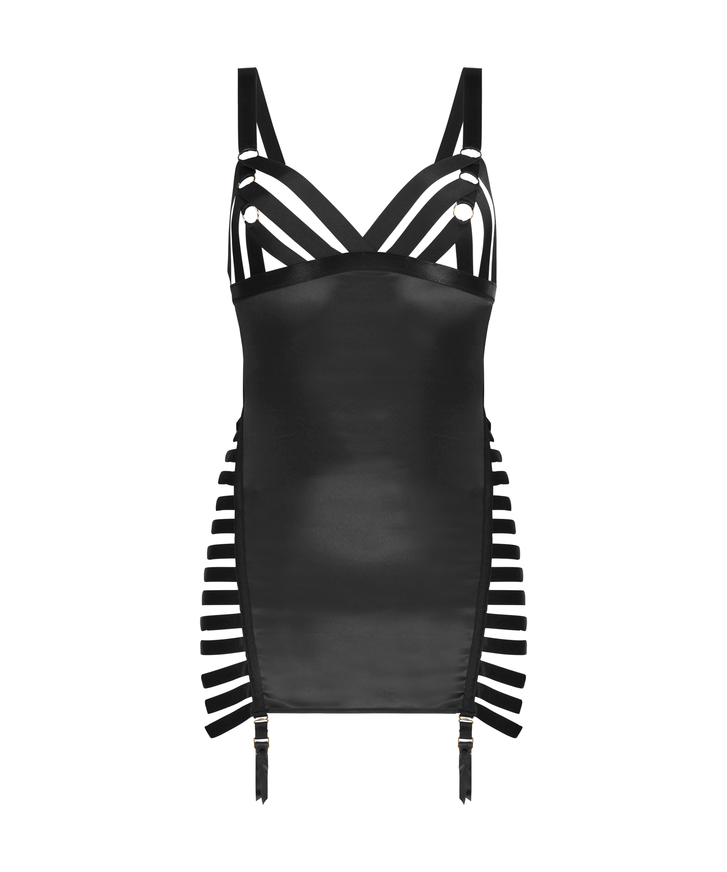 Feel sexy in this slip dress! It has strappy details for a provocative look. The dress is made of satin fabric on the front and has a zipper closure on the back, together with suspender belt loops to attach your favourite hosiery. Part of our Private collection.
