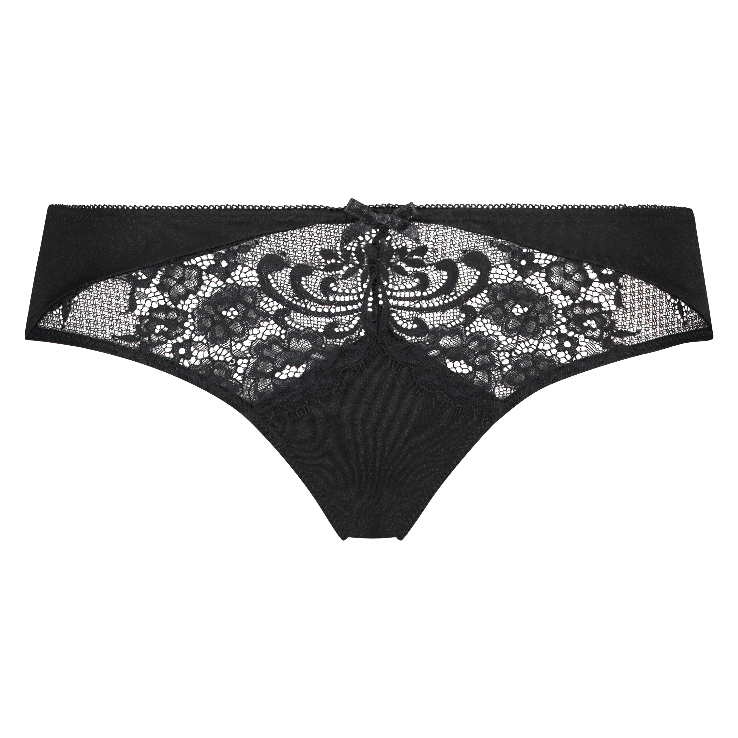 This brazilian is made from a mix of microfibre fabric and lace. The back is all lace. The bow at the front is a nice finishing touch!