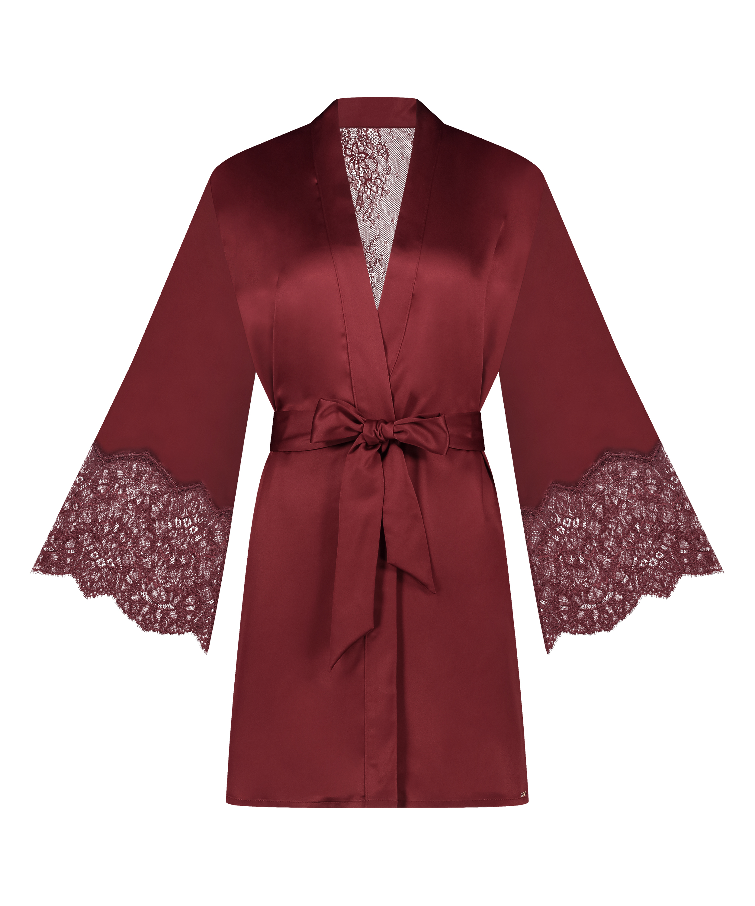 Don't miss this elegant kimono! With lots of romantic lace and a real tie closure. This adorable kimono has wide sleeves and is made of satin material what gives it a luxurious look. Combine with matching items. Part of our Noir collection.