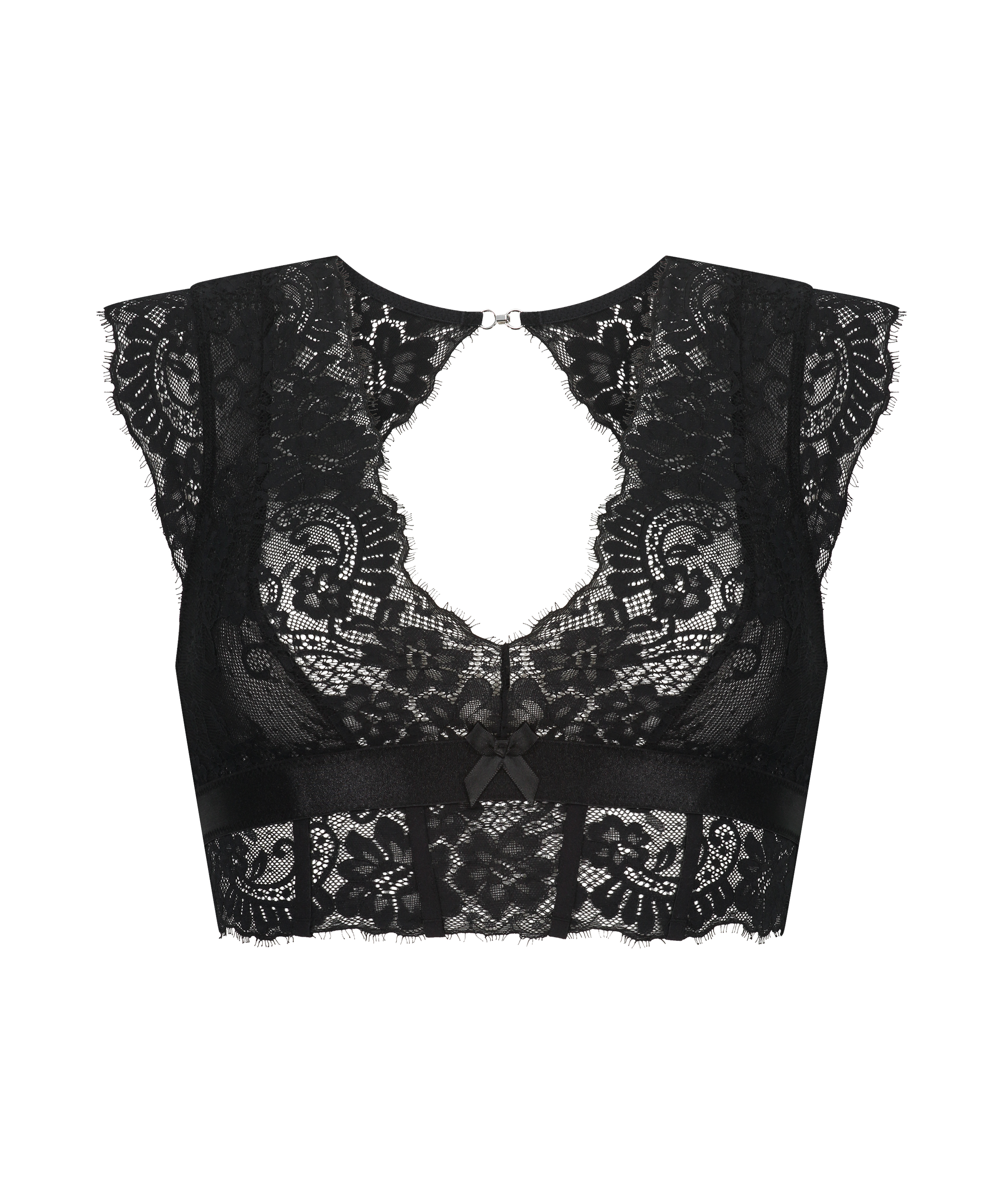 Feel sexy in this bralette top! The bralette is made of lace, has cap sleeves, a sexy open back and a closure clip on the back of the collar. The top is also perfect to wear on a night out!