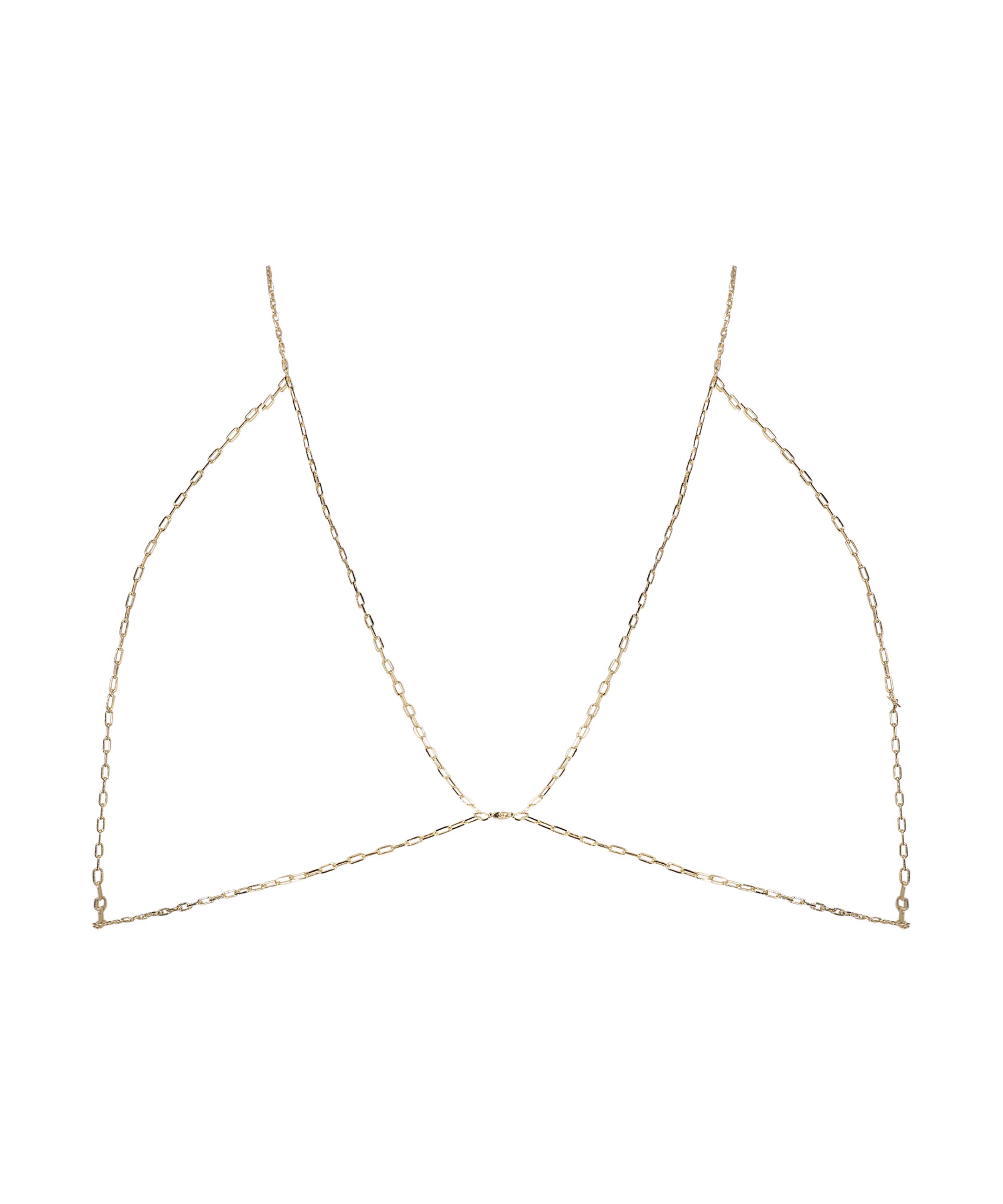 Style your outfit with this super-pretty chain bralette! It is gold-coloured. Match with a fun outfit or lingerie set!