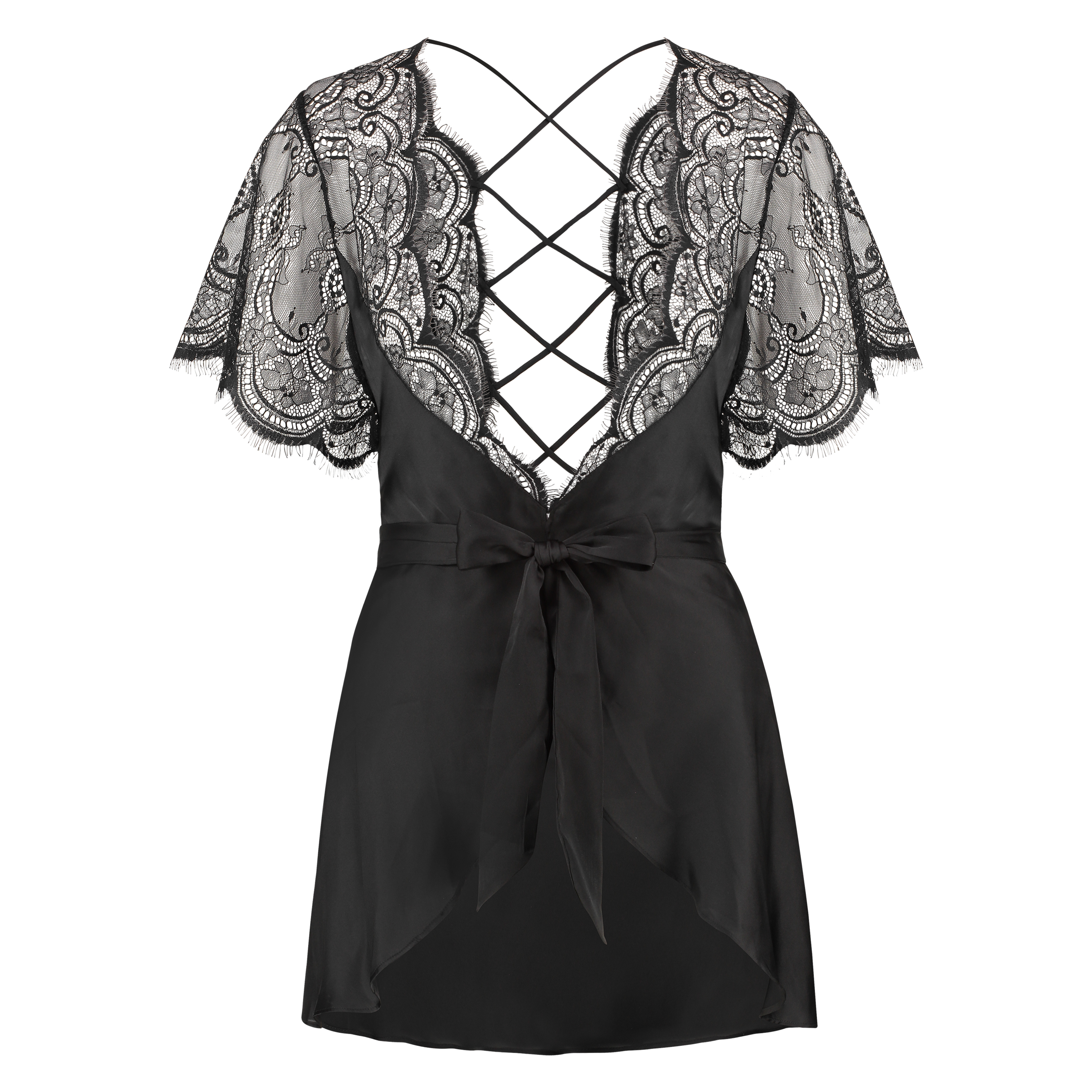 Sexy kimono with semi-transparent lace and mesh. This kimono has short sleeves and an elegant closed back. Part of the Private Collection.