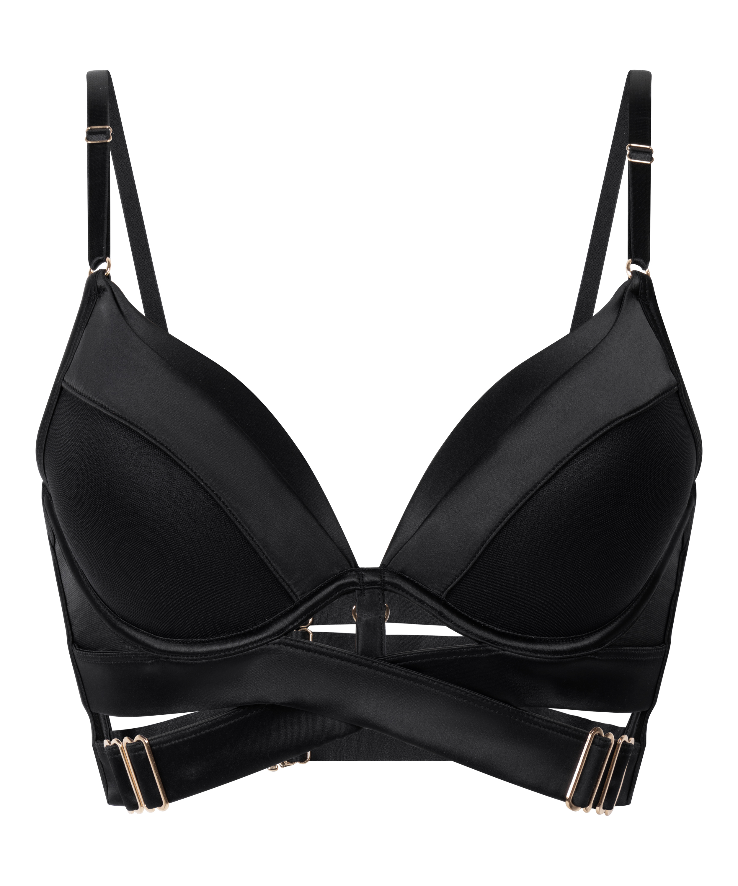 Elevate your lingerie collection with this irresistibly seductive push-up bra! The silky smooth, mesh-accented padded cups enhance your shape, while underboob bands with sleek metal loop details add a daring touch. A wide underbust band and triple-hook closure provide ultra-supportive comfort for a flawless fit!
