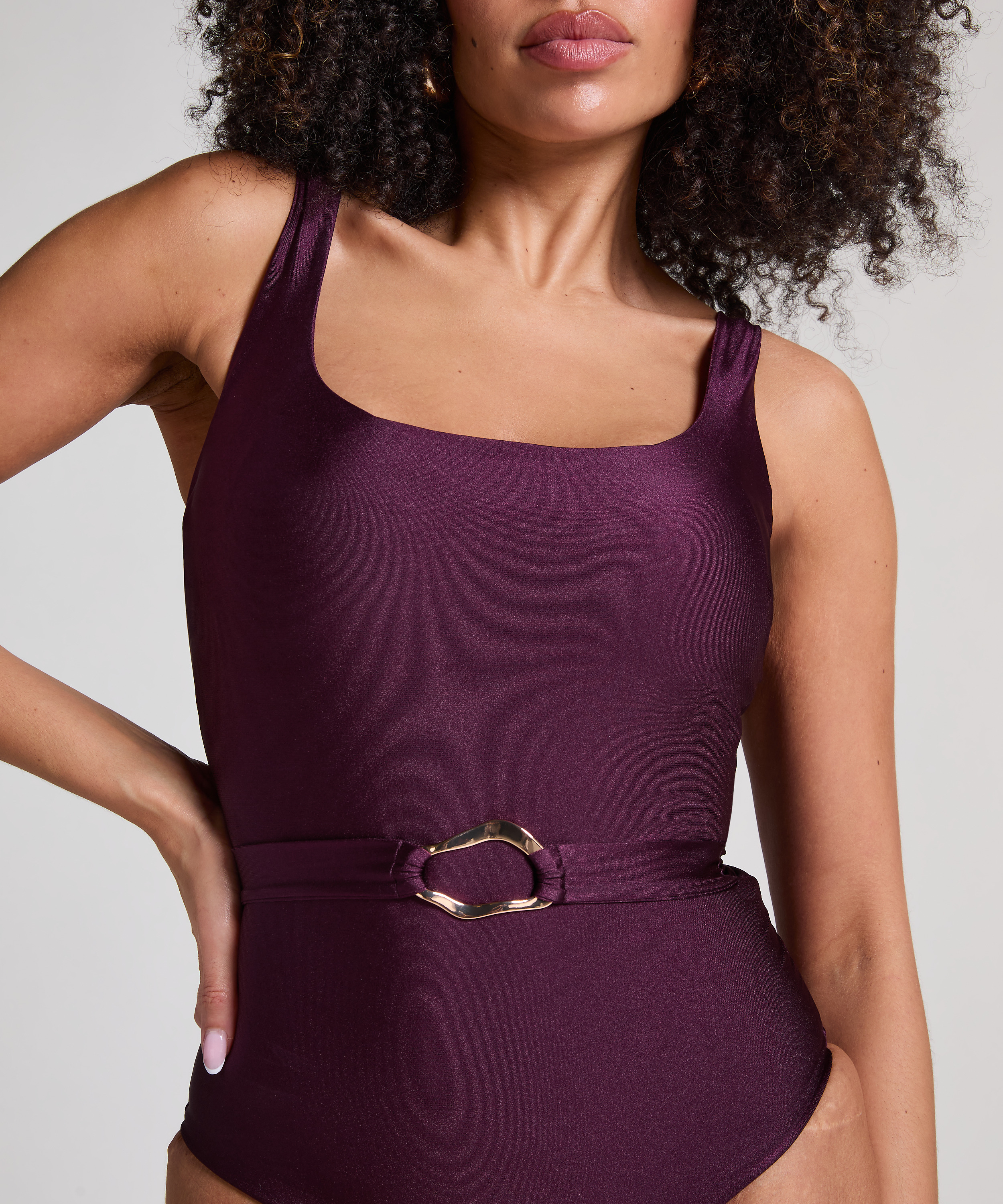 Sculpt your silhouette in style with this shaping bathing suit, designed to enhance your natural curvers while providing a flattering fit. The gold detail in the front adds and elegant touch, making this one-piece timeless.Our shaping bathing suits are designed to contour the body, giving a firm fit and feel. We suggest to size up one size, for a more relaxed fit.