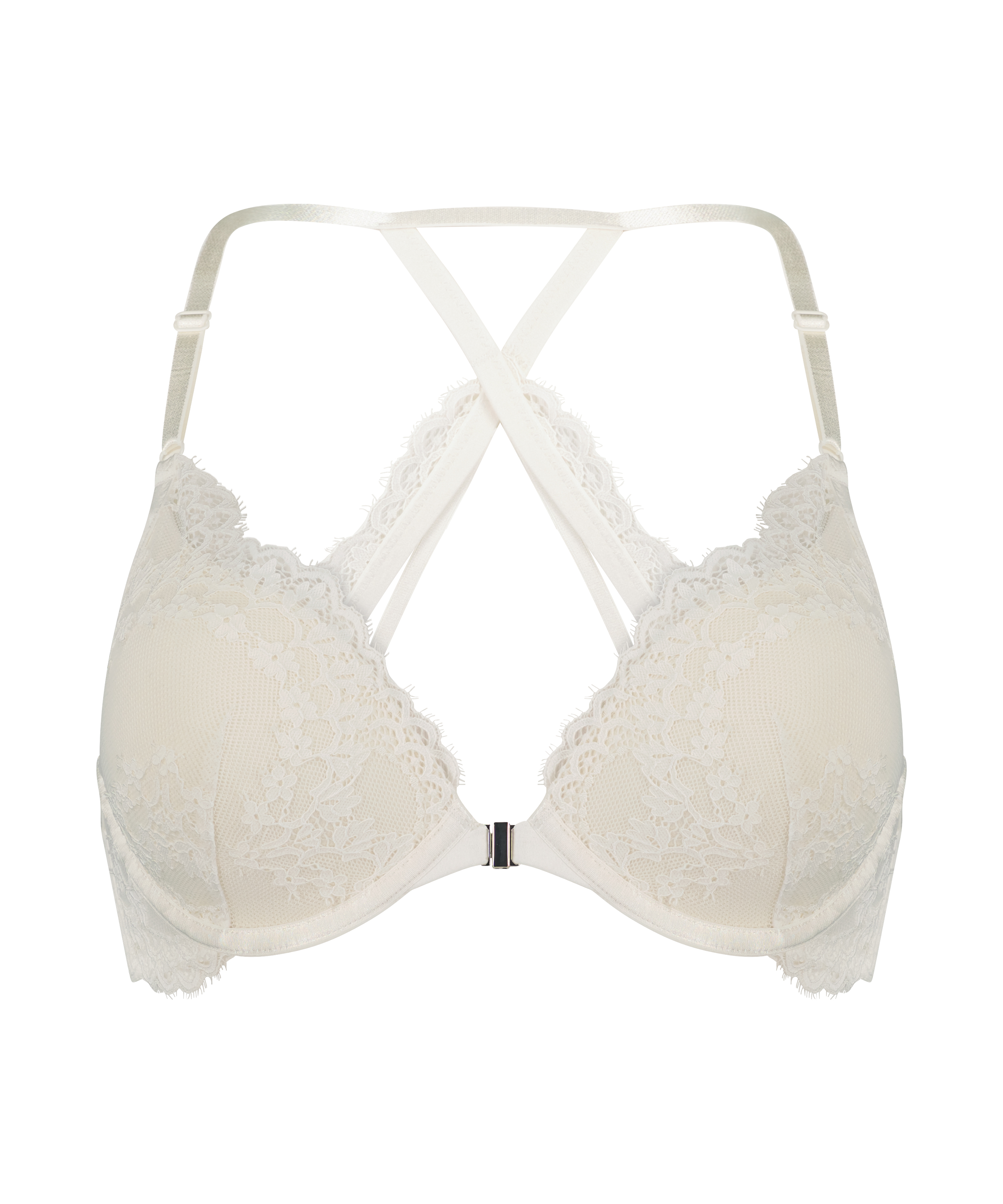 Feel amazing in this push up bra! With a frontal closure for easy wear and a racerback with lots of lace. It is decorated with lace on the cups, along with sexy strappy details. Find the matching knickers and complete the set!