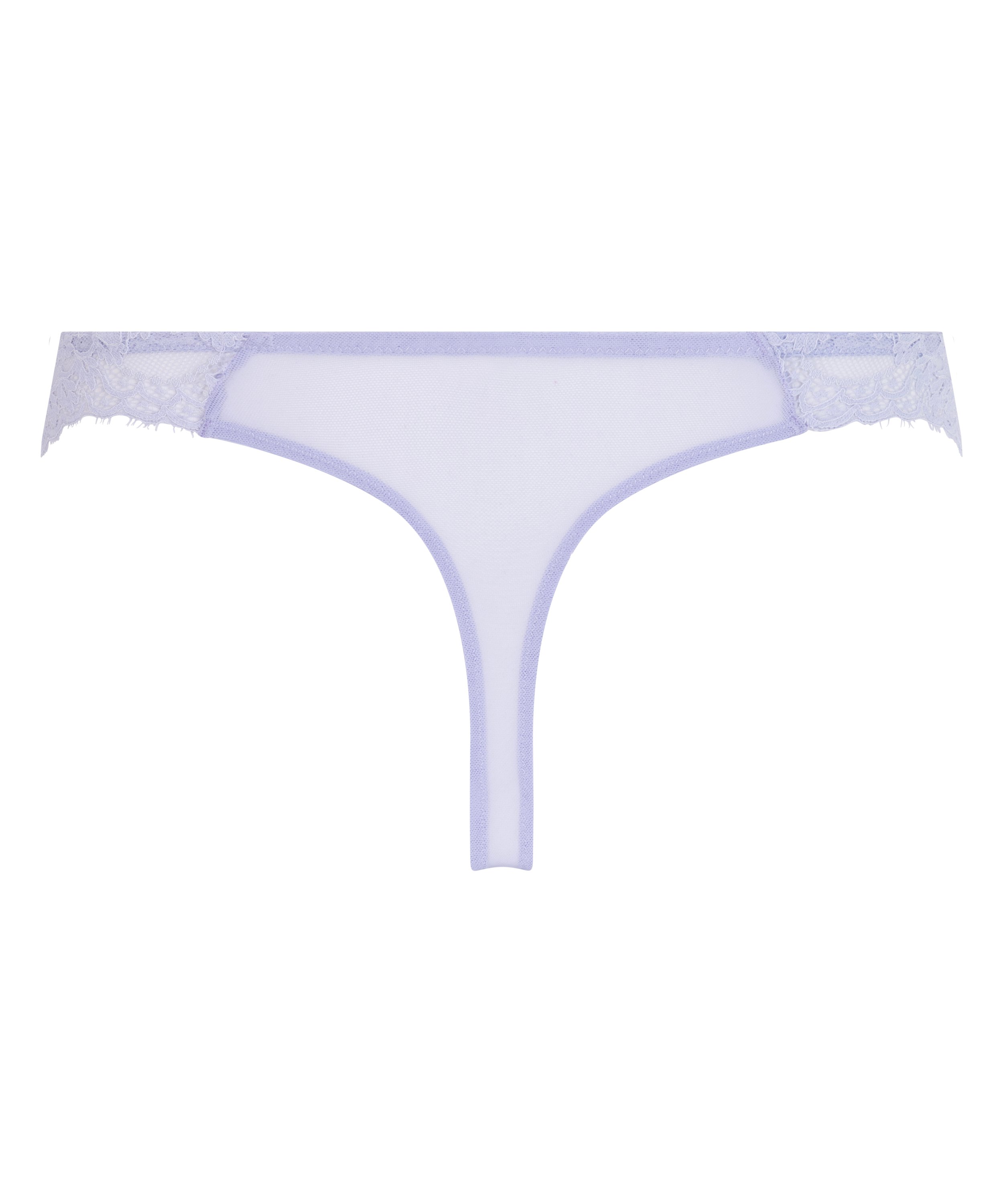 This trendy thong features a transparent lace front and a mesh back. A small button in the middle of the front adds a finishing touch.