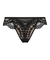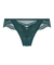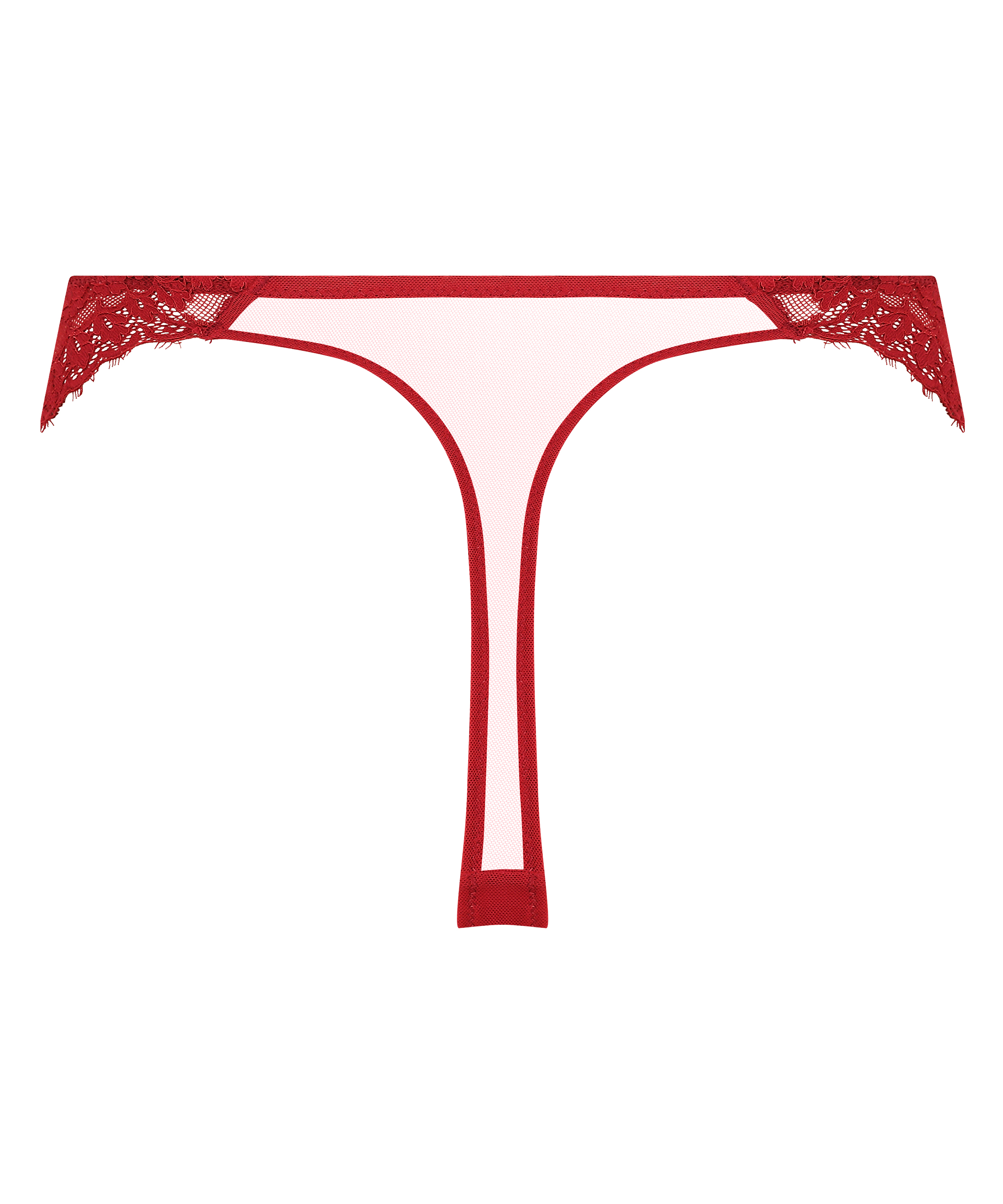 This trendy thong features a transparent lace front and a mesh back. A small button in the middle of the front adds a finishing touch.