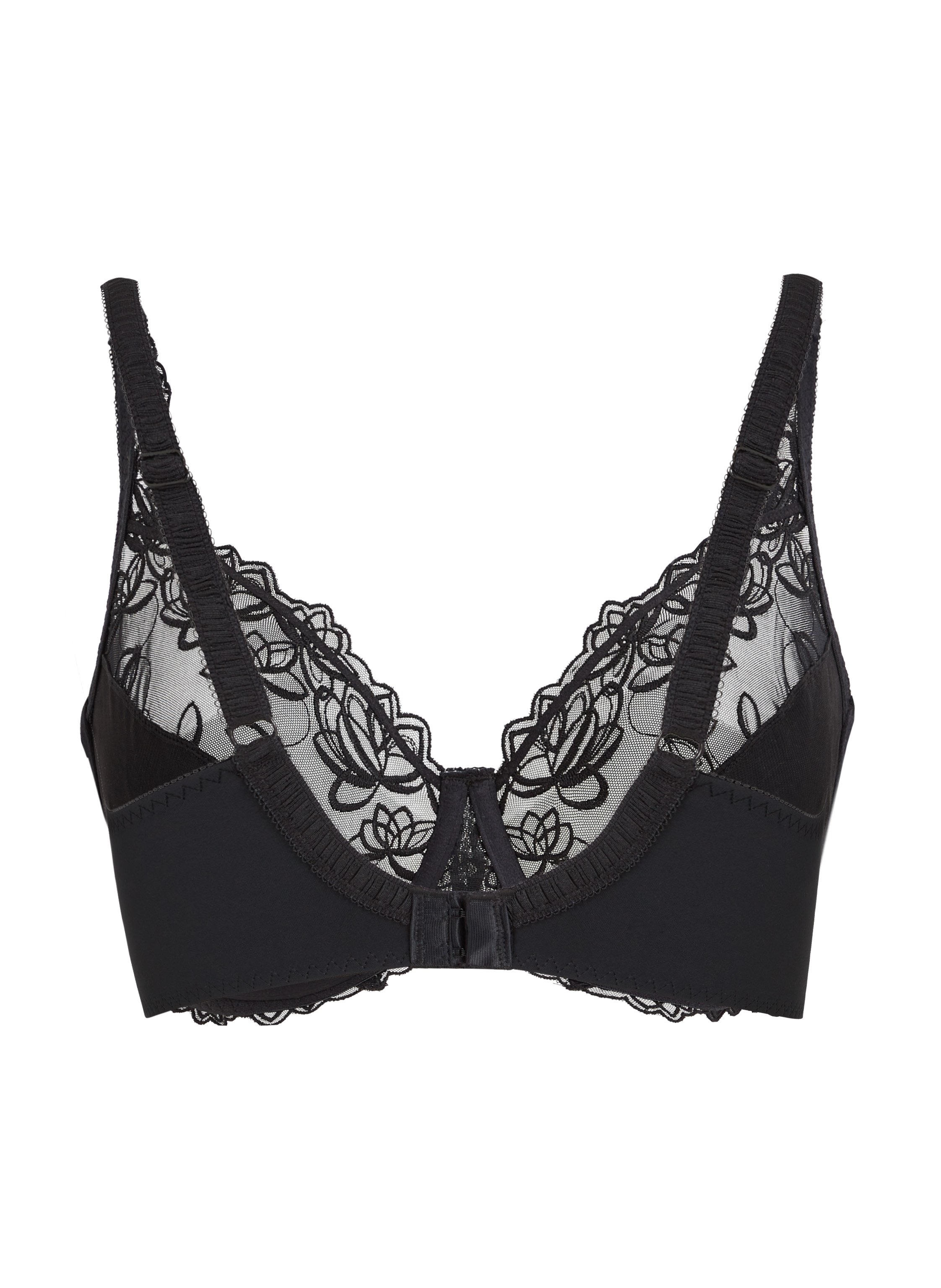 This non-padded underwired bra is made from non-see-through fabric with semi-transparent lace at the top. The cups are decorated with a floral pattern. Combine with the matching Diva knickers for a complete set.