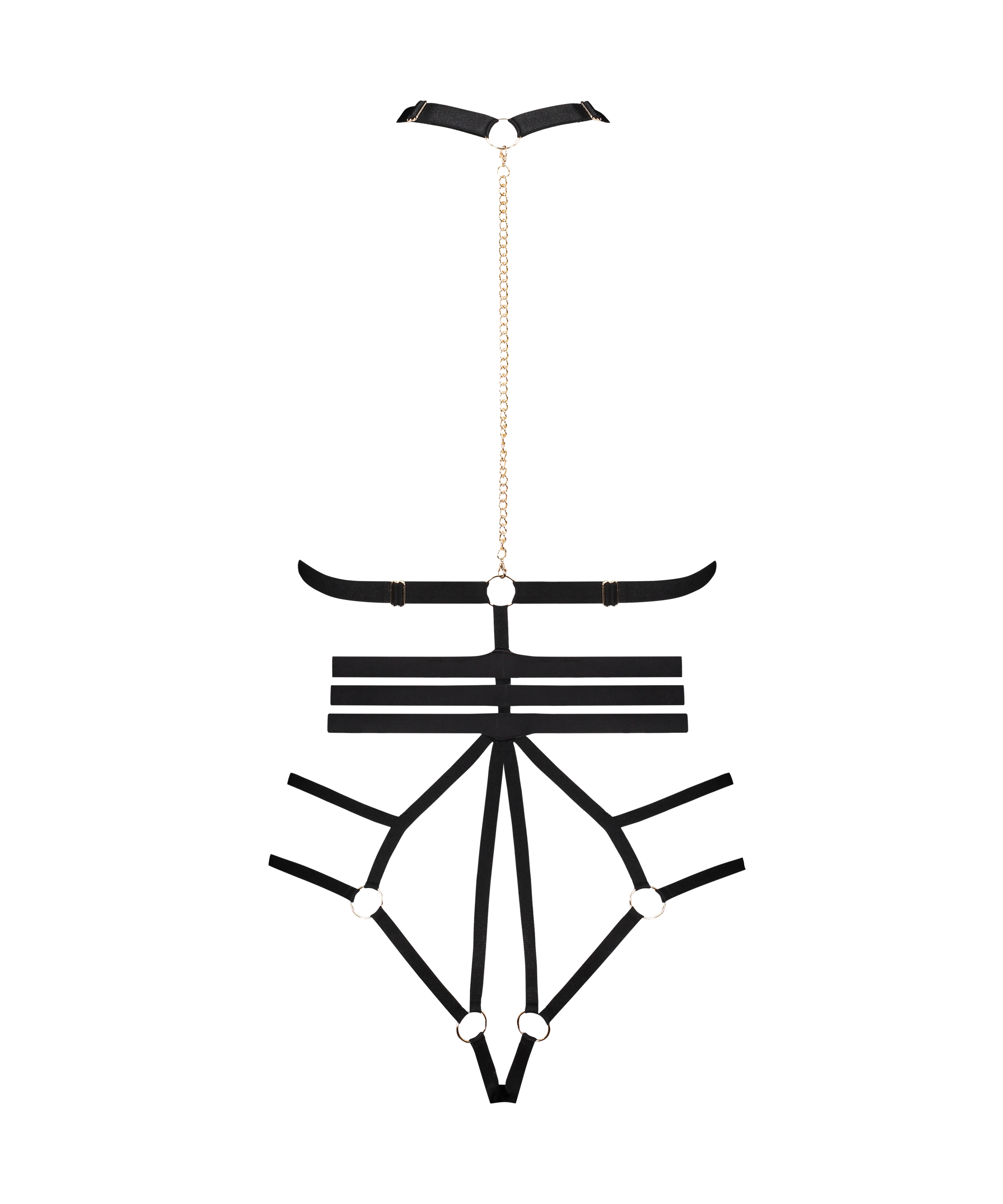 Chic and sexy, the Dominatrix strappy body features a detachable golden chain, open crotch and directional strapping. The beautiful design of the straps is provocative yet gently supportive. Together with the halter neckline, this is a standout piece. Part of the Private collection