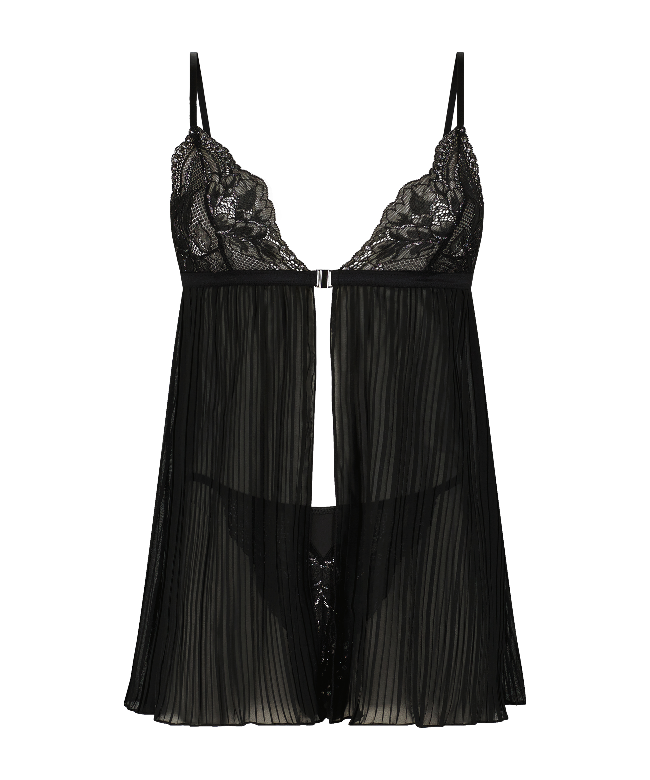 Bring some glamour to your lingerie collection with this beautiful lace babydoll! The luxurious silver detailed lace and adjustable straps makes this sexy babydoll a dream to slip into. It has a front closure and comes with a matching brazilian slip.