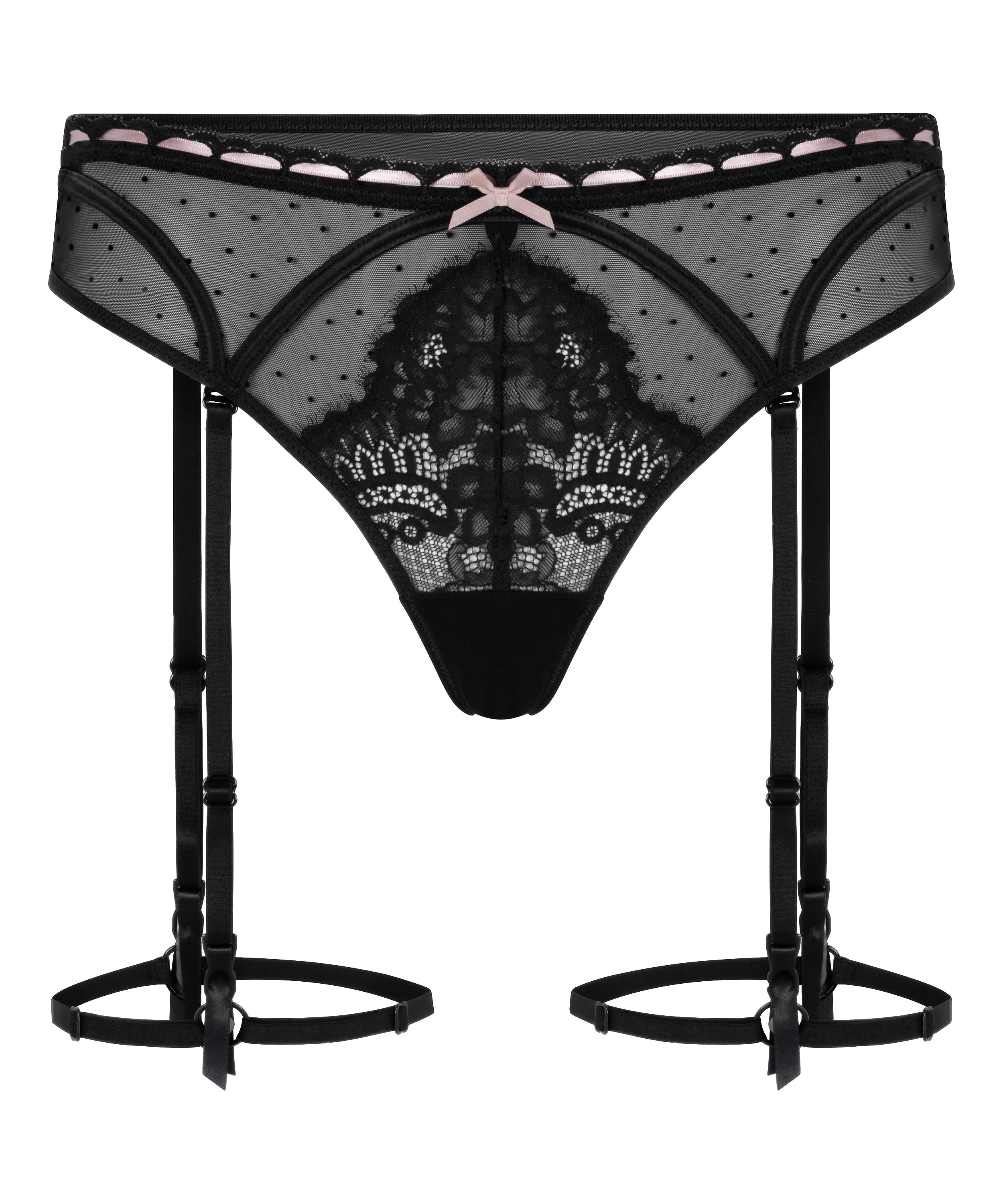 Have the boldest look with this suspender belt thong, crafted in romantic floral and pois lace for a playful twist. Sweet bow details add a feminine touch, while the scrunched back design creates a flattering, cheeky silhouette. Adjustable straps ensure a secure fit for your favorite stockings. Perfect for pairing with the matching bra and bralette!