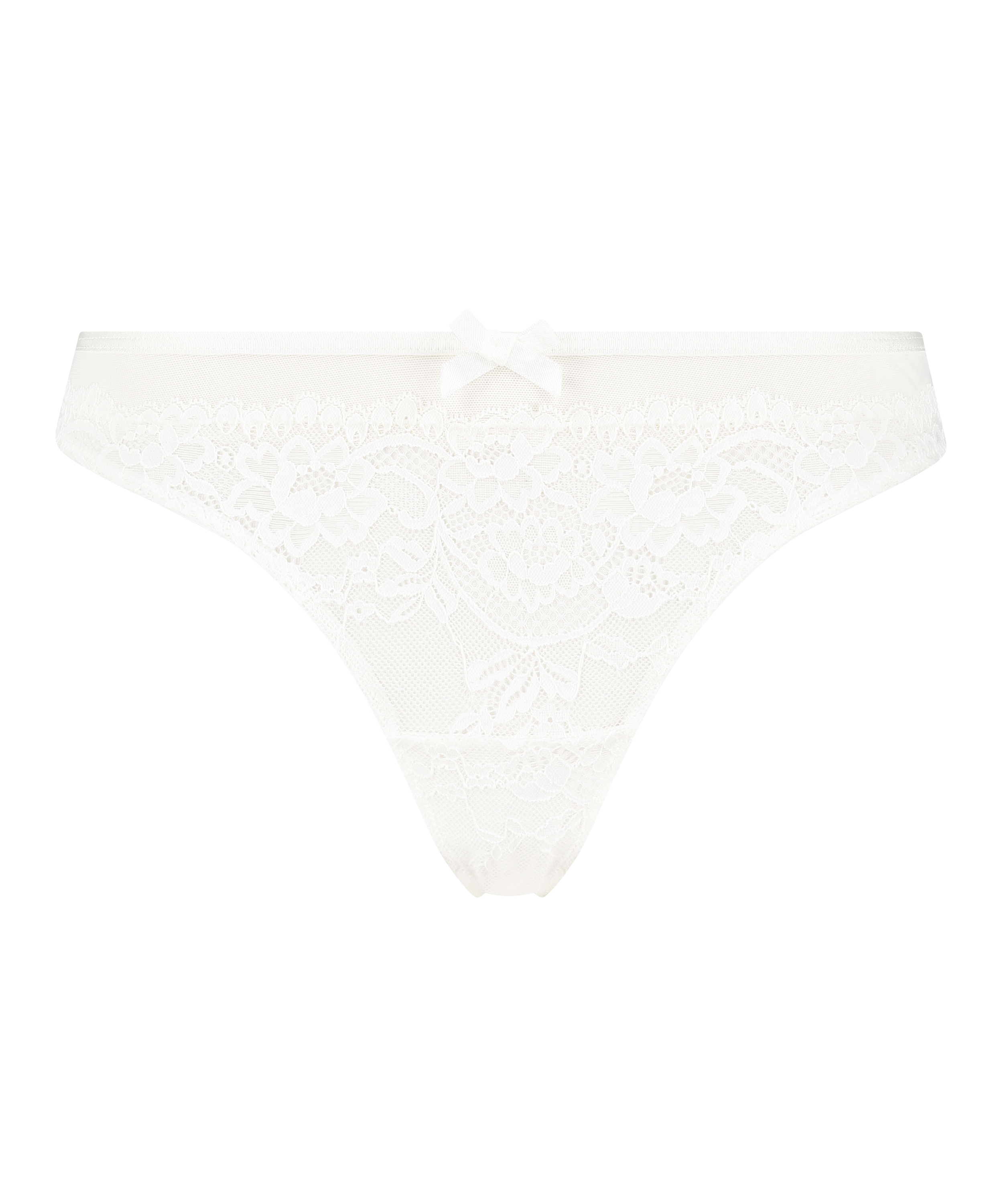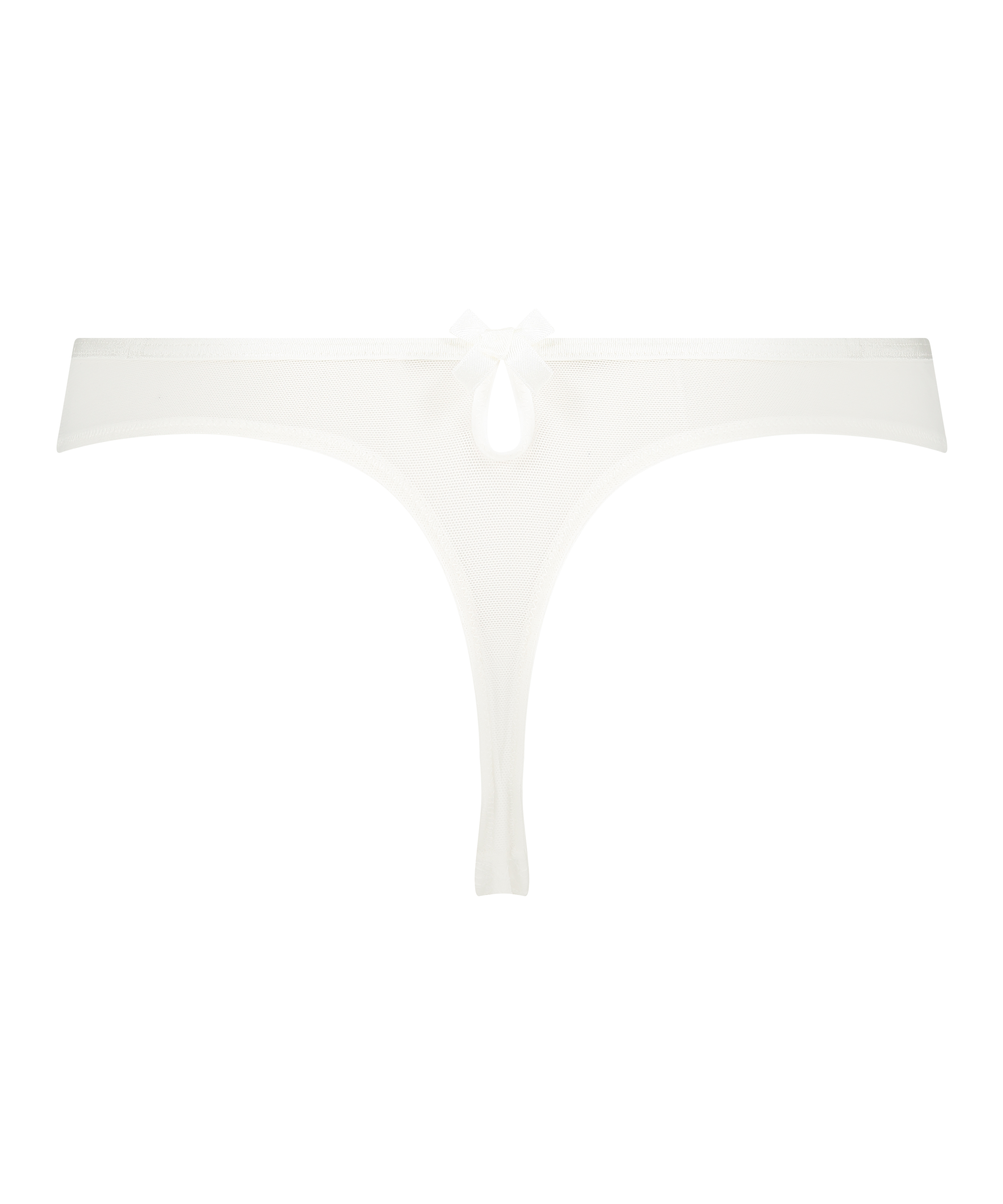 This very pretty thong is made from semi-transparent fabric and finished with lace. The small bow on the front adds a feminine touch.