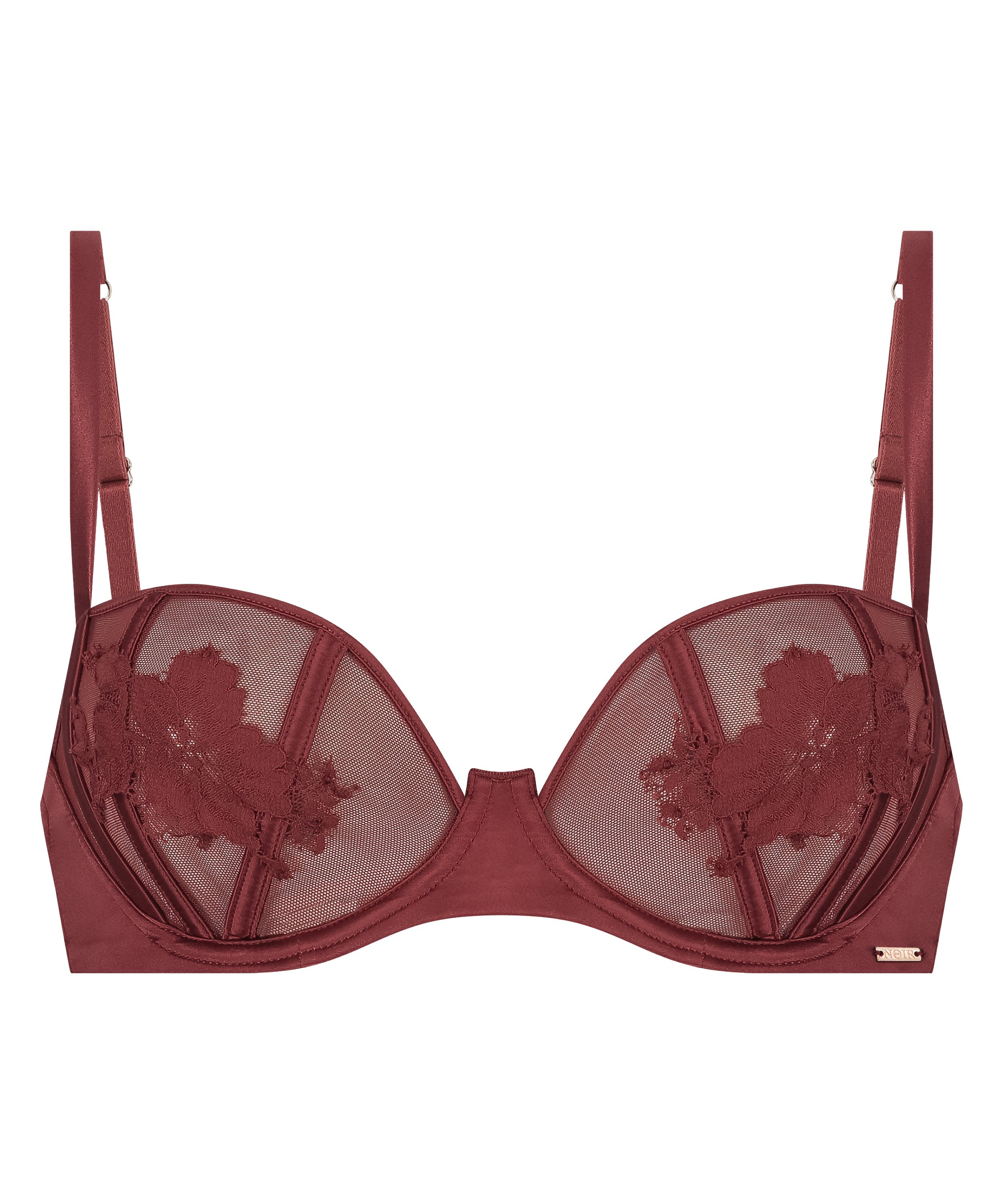 The Ember bra is a stunning blend of subtlety and sophistication. This chic balconette design is decorated with a delicate embroidery and a beautiful sheer fabric. Elevate your lingerie collection with this masterpiece and pair with the matching Ember brief or thong for a seamlessly captivating look! Part of the Noir collection.