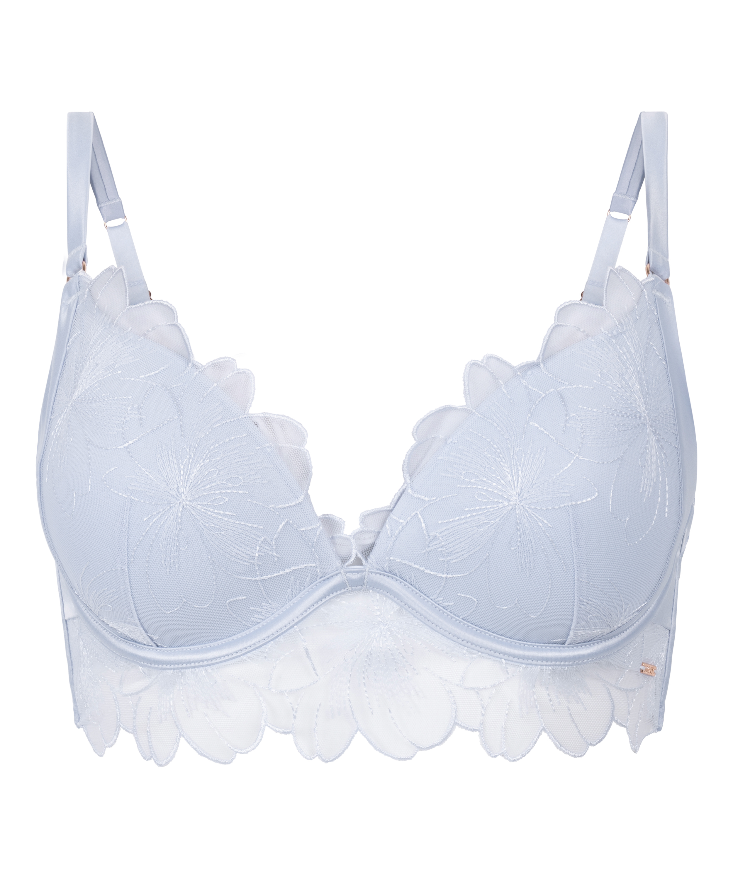 Elevate your lingerie collection with the Emilia Padded Plunge Push-Up longline bra! Featuring delicate floral embroidery and a structured design, it offers a sculpted, flattering fit. The padded underwired cups and adjustable straps ensure support and comfort, perfect for a look that exudes confidence and charm!