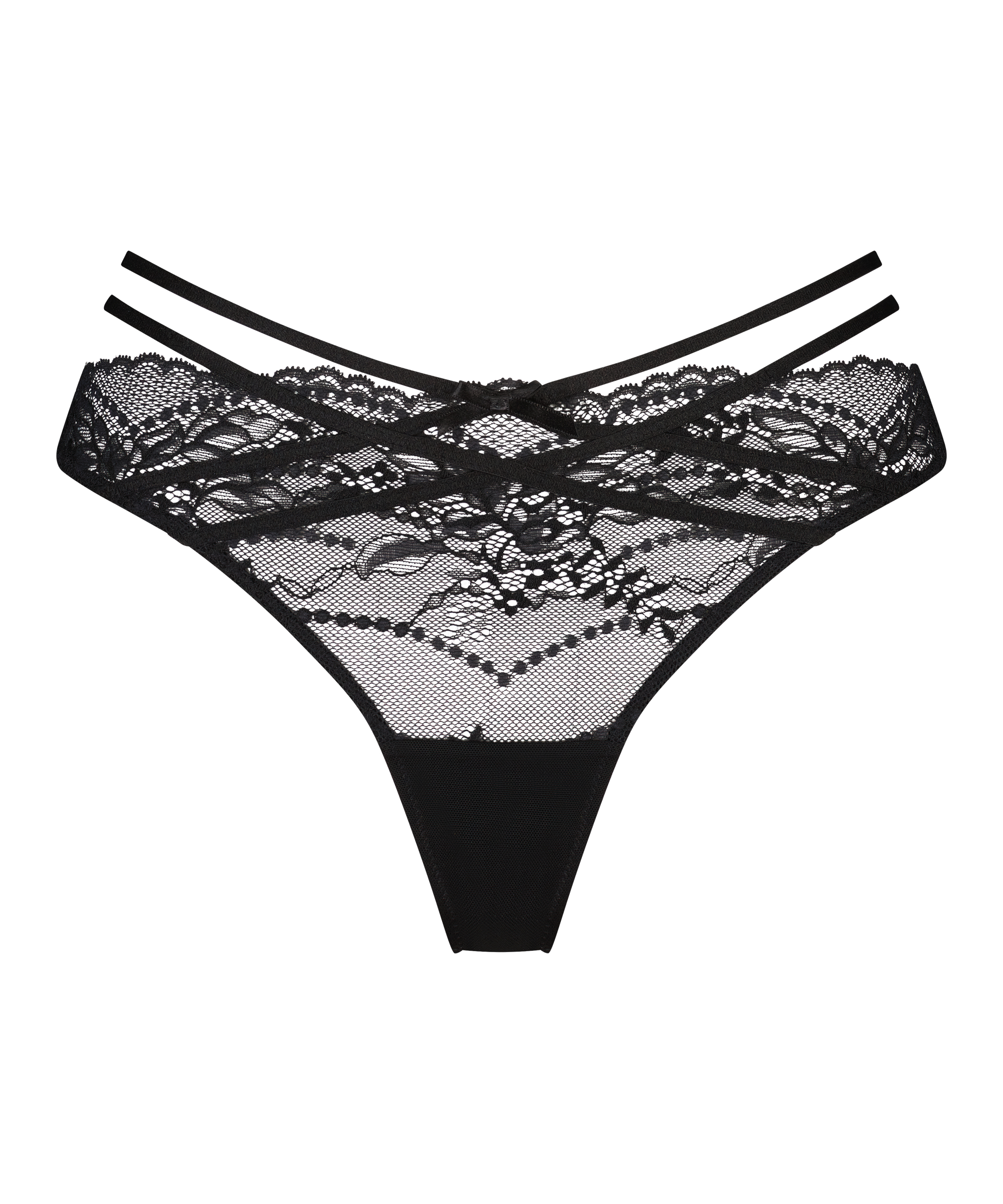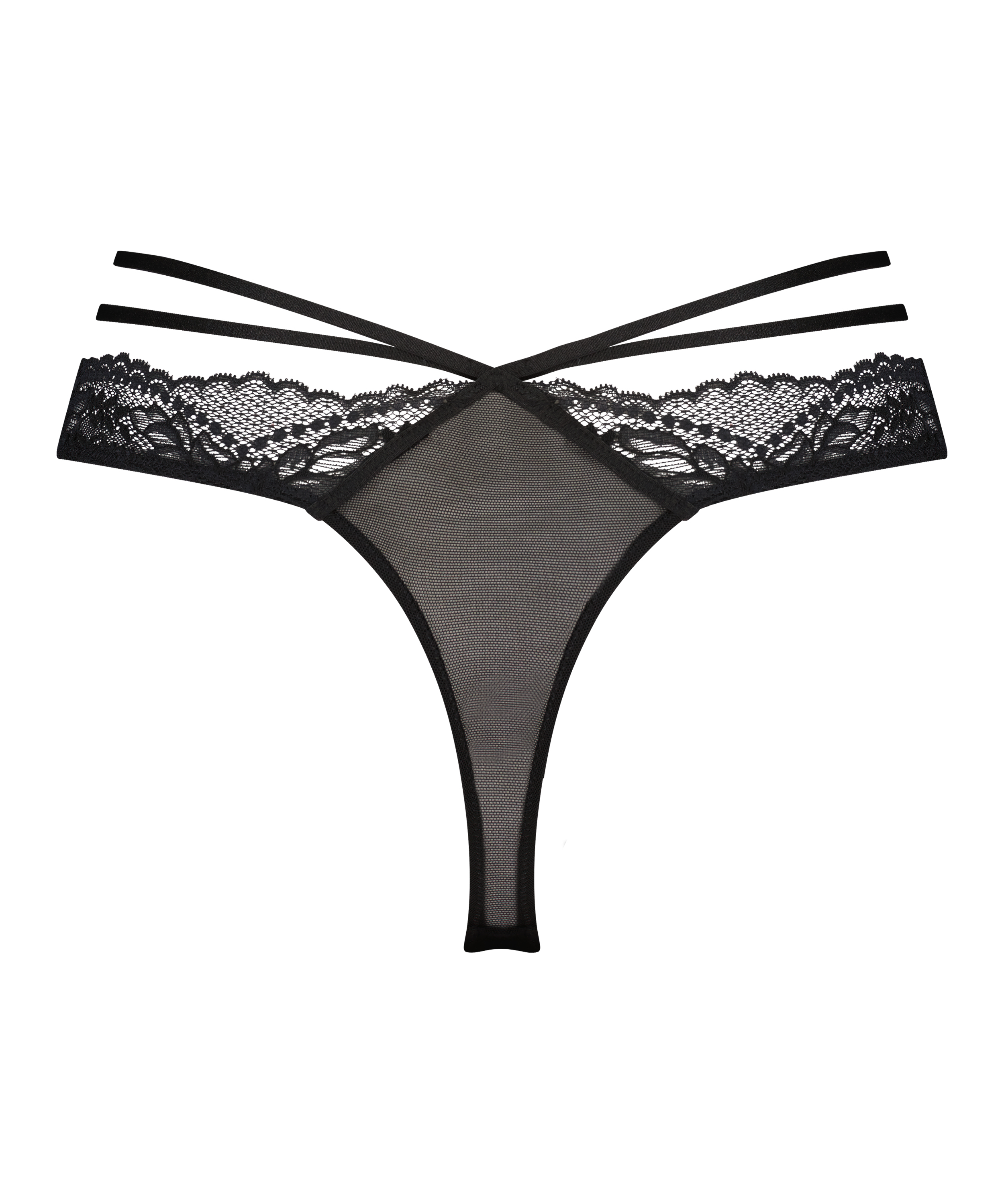 Don't miss this stunning thong! With a semi-transparent frontal look with embroidered designed. Along with frontal and side strappy details for an extra sexy look. On the crotch area, a soft material is used for the outmost comfort. Finished off with a cute frontal bow. Mix and match with a bra!