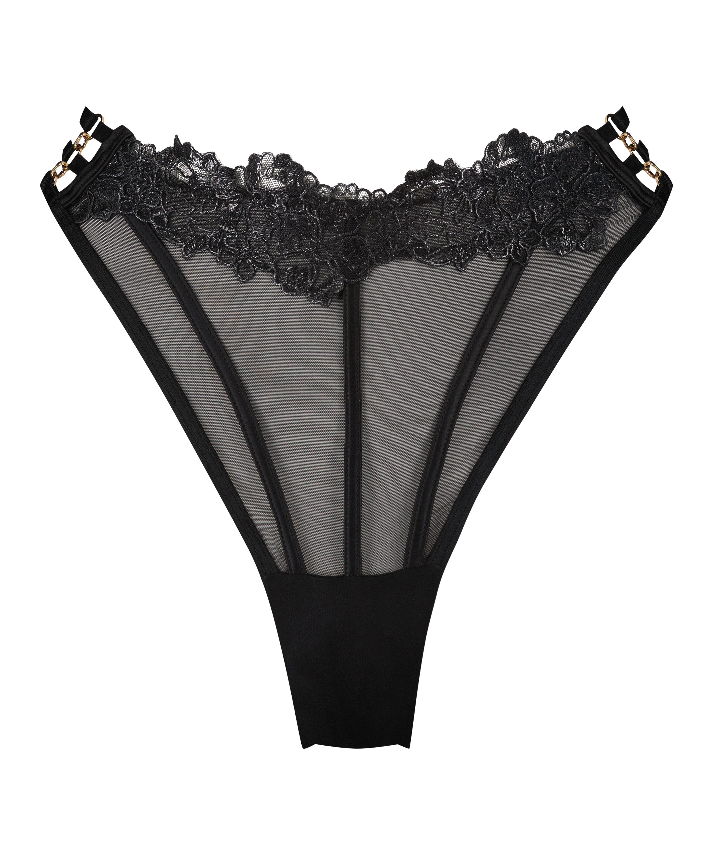 Get seductive in this brazilian! This brazilian has beautiful strappy details. The lace fabric on the front and back give this item an elegant yet sexy look. Combine with the matching items from our Private collection.