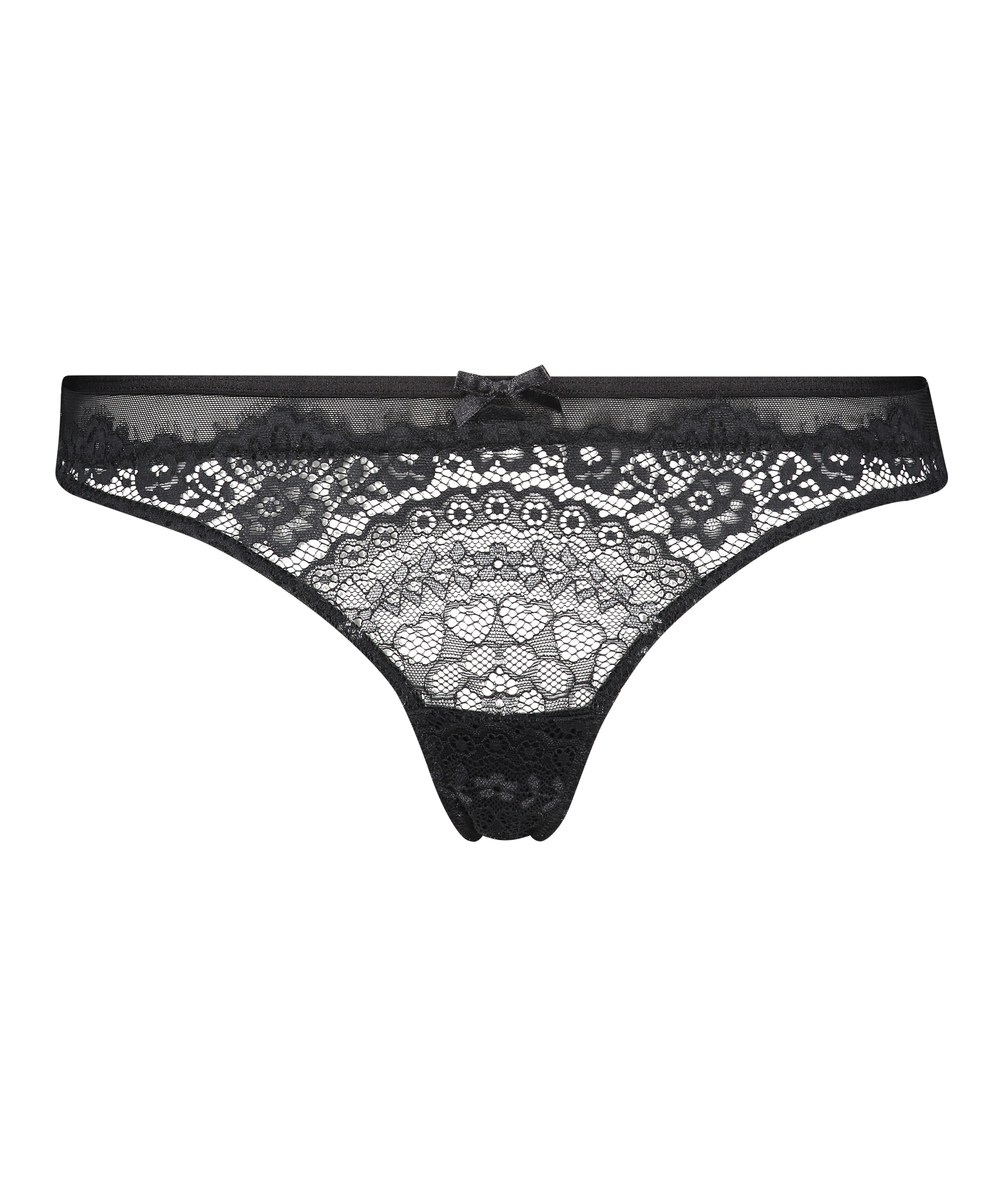 This thong is made of lace and lurex. The lace is decorated with flowers and hearts. The back is all mesh. Combine with the matching bra for a complete look!