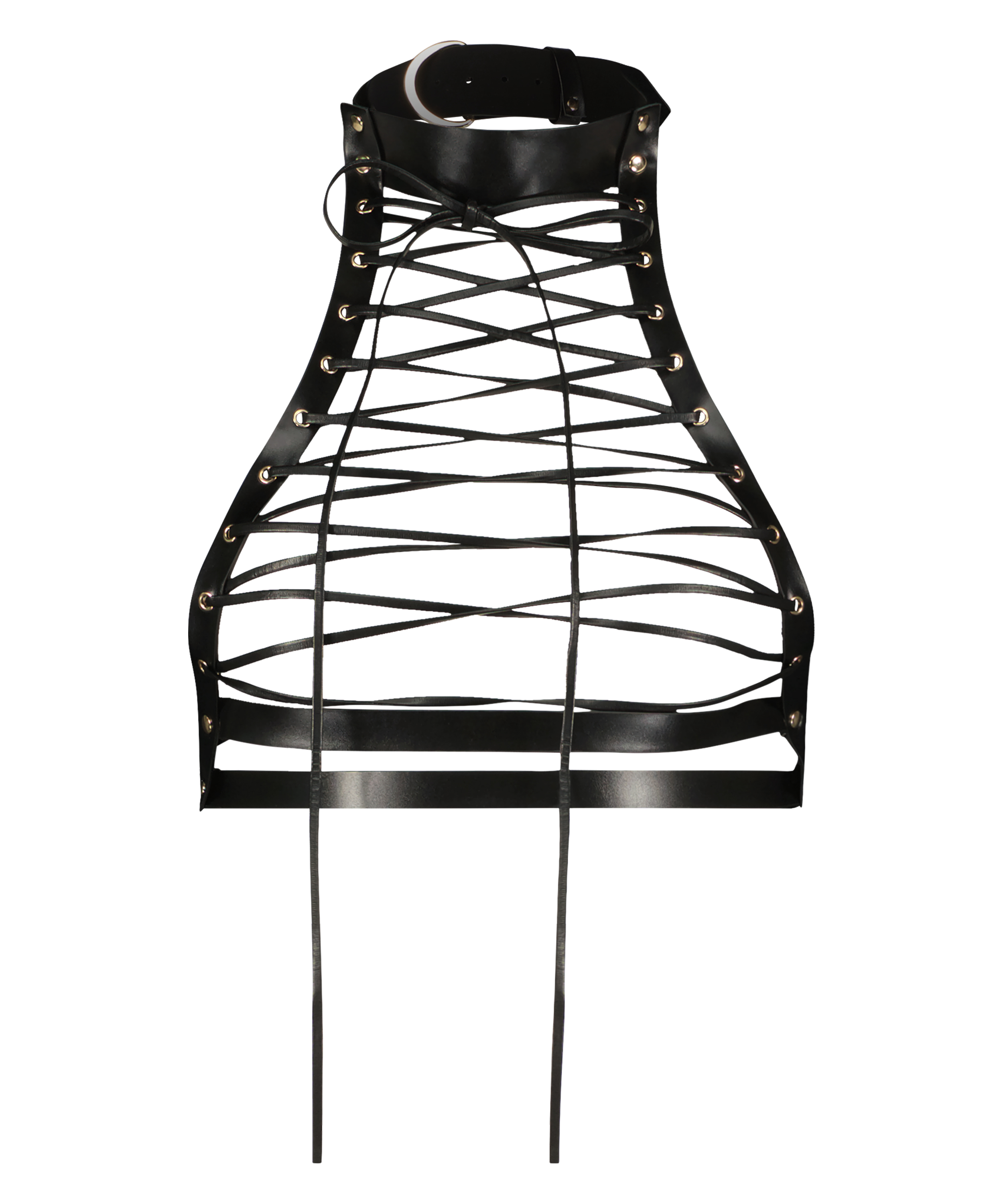 Want to take your set to the next level? This faux leather bralette is perfect for you. Made completely of strappy details, with adjustable straps and hardware. Find the matching suspenders and complete your set!