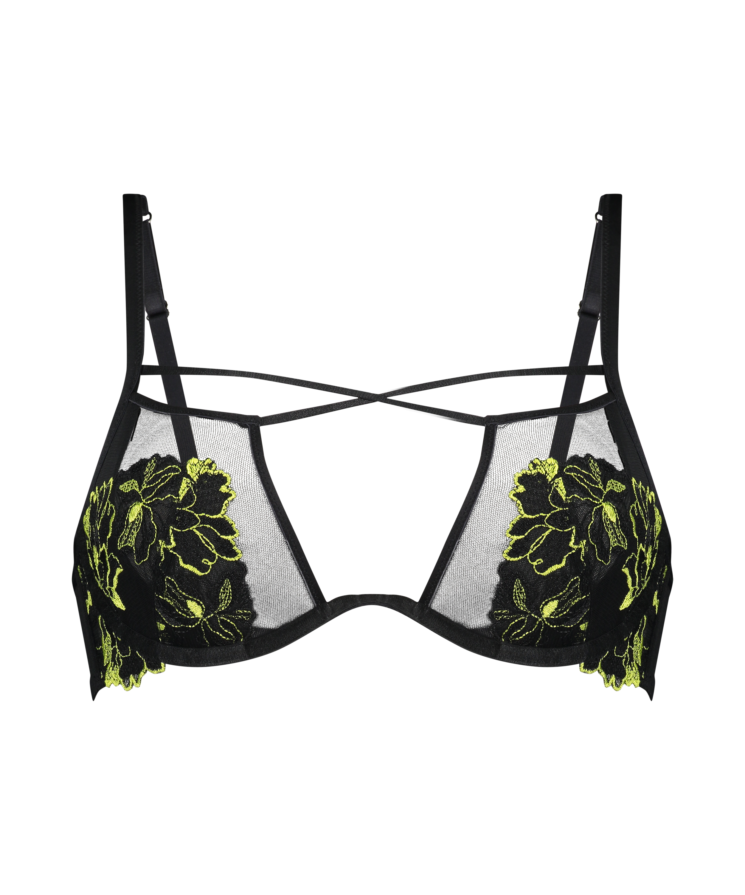 Go for a sexy and exciting lingerie set with this bra featuring semi-transparent lace and strappy details.