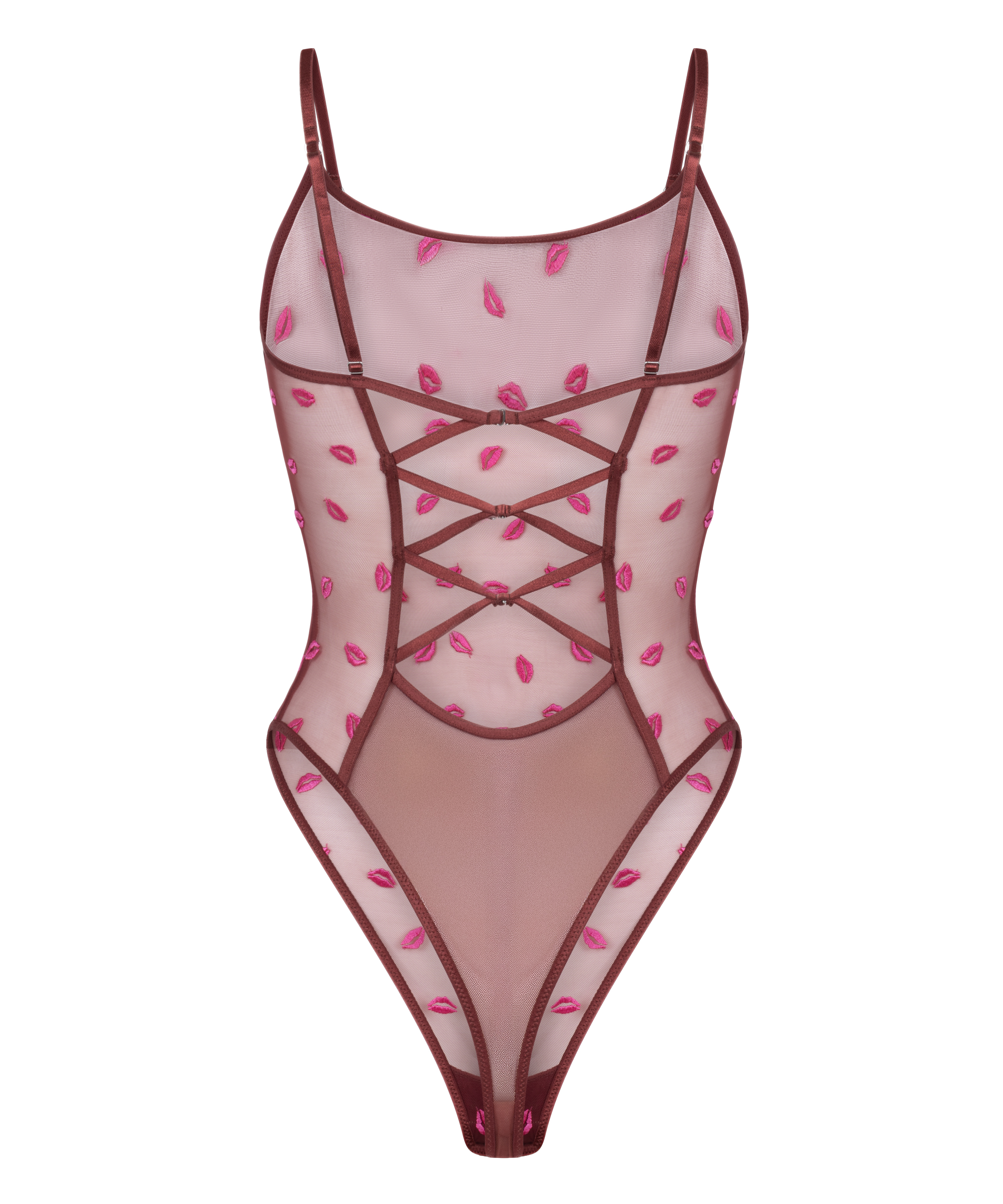 Be irresistible with this sheer mesh body, designed for a bold yet romantic look. Featuring an open back with crisscross string details, it creates a striking silhouette. Adorned with playful kiss embroideries, this piece blends flirty elegance with modern trend. Add it to your wardrobe and elevate your outfits!