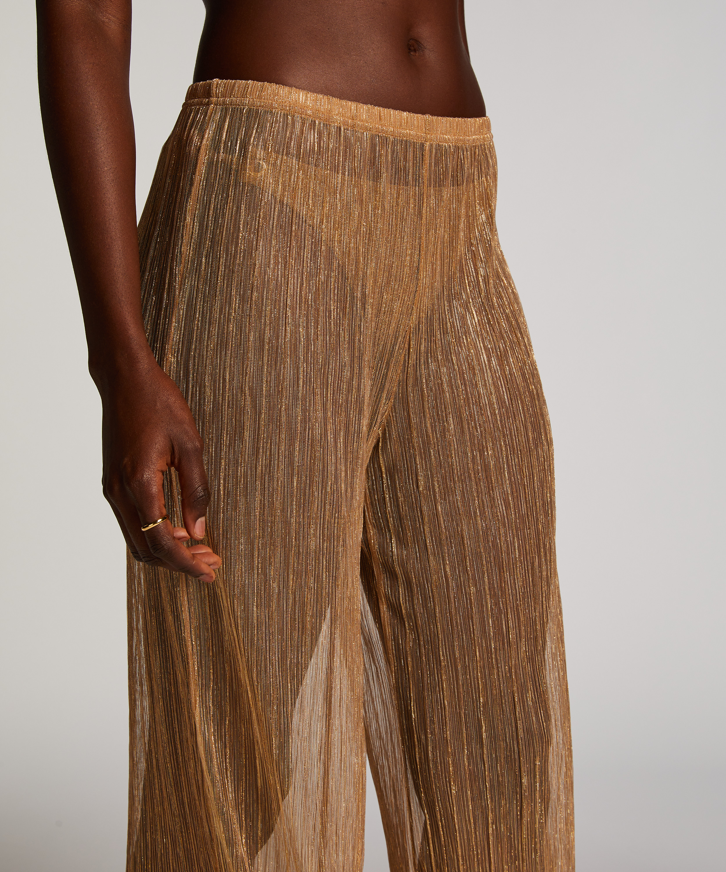 These pants are going to style up your beach look! Made with flowy see-through material and a shimmery glitter lurex that makes you shine on the boulevard. Pair with the shimmer bikini to complete this look and steal the show this summer!