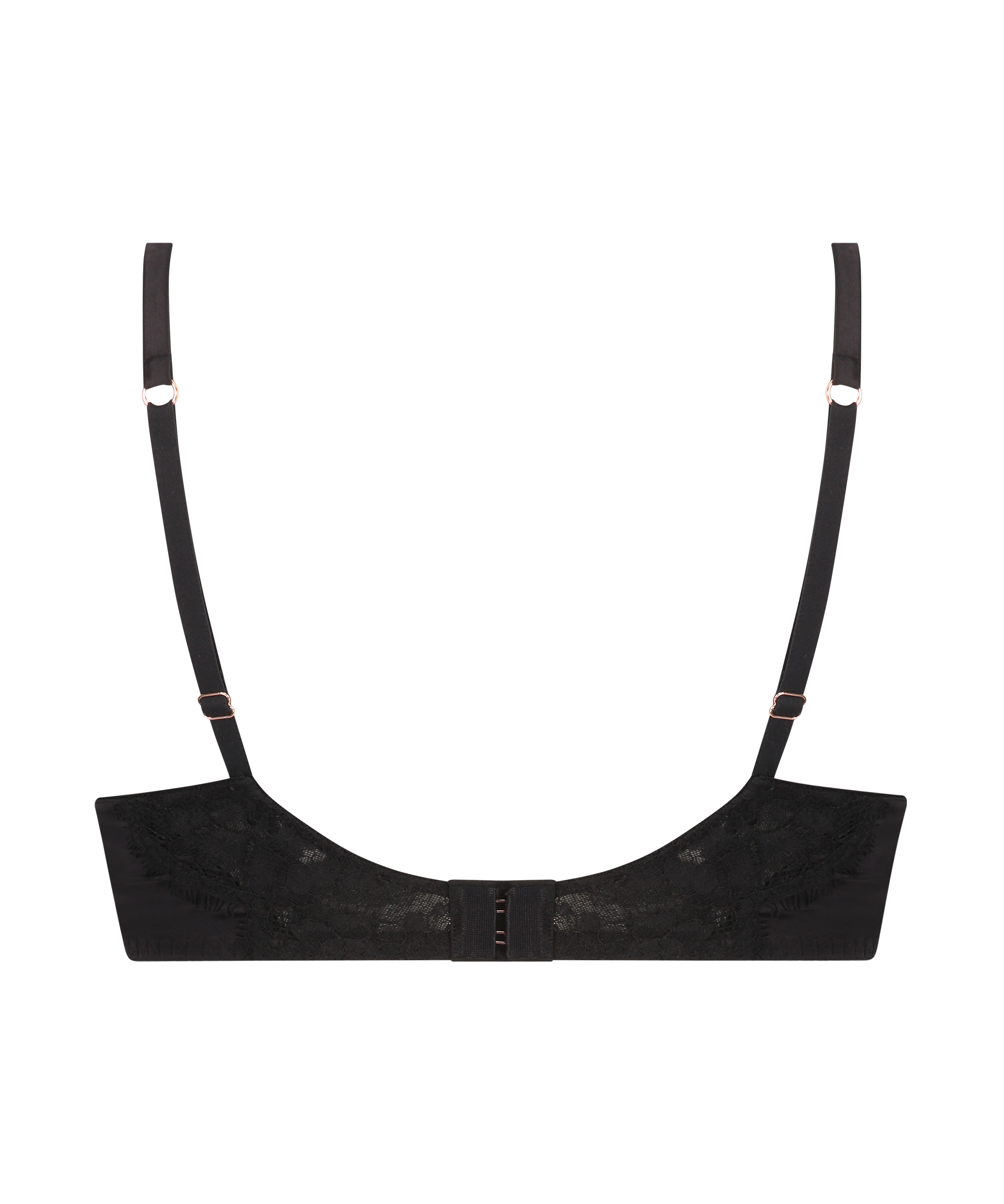 We just love this gorgeous bra! The bra has lace details and a small bow at the front. The shoulder straps are adjustable, so you can shorten or lengthen them to fit. Combine with matching items from the Noir Collection for a complete lingerie set!