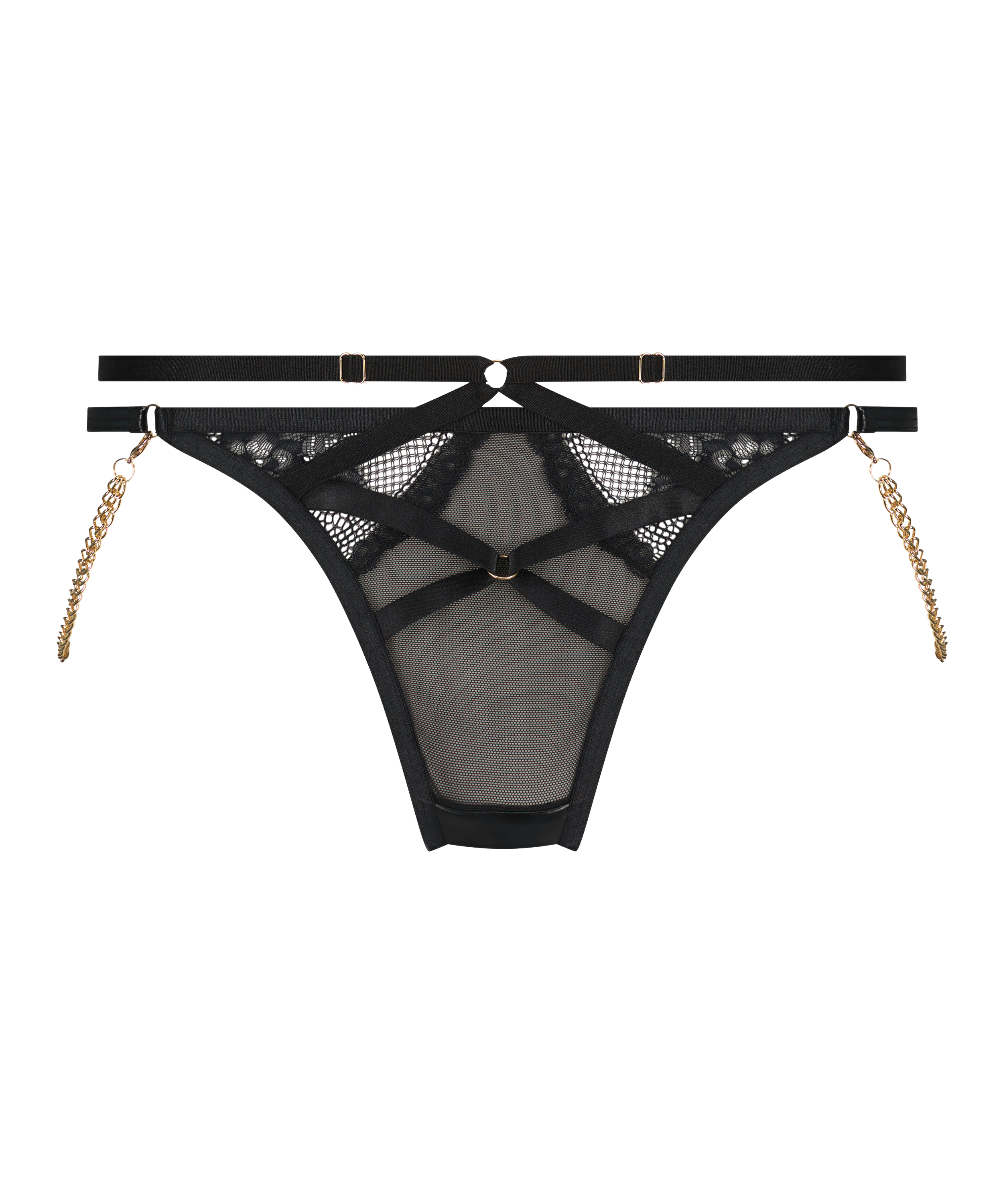 Take your lingerie set to the next level with this super sexy thong! Made from mesh material, decorated with lace and strappy details for a spicy look. There is a cut out detail on the back and the thong is decorated with a removable golden chain. Match with the Hecate bustier to complete the set!