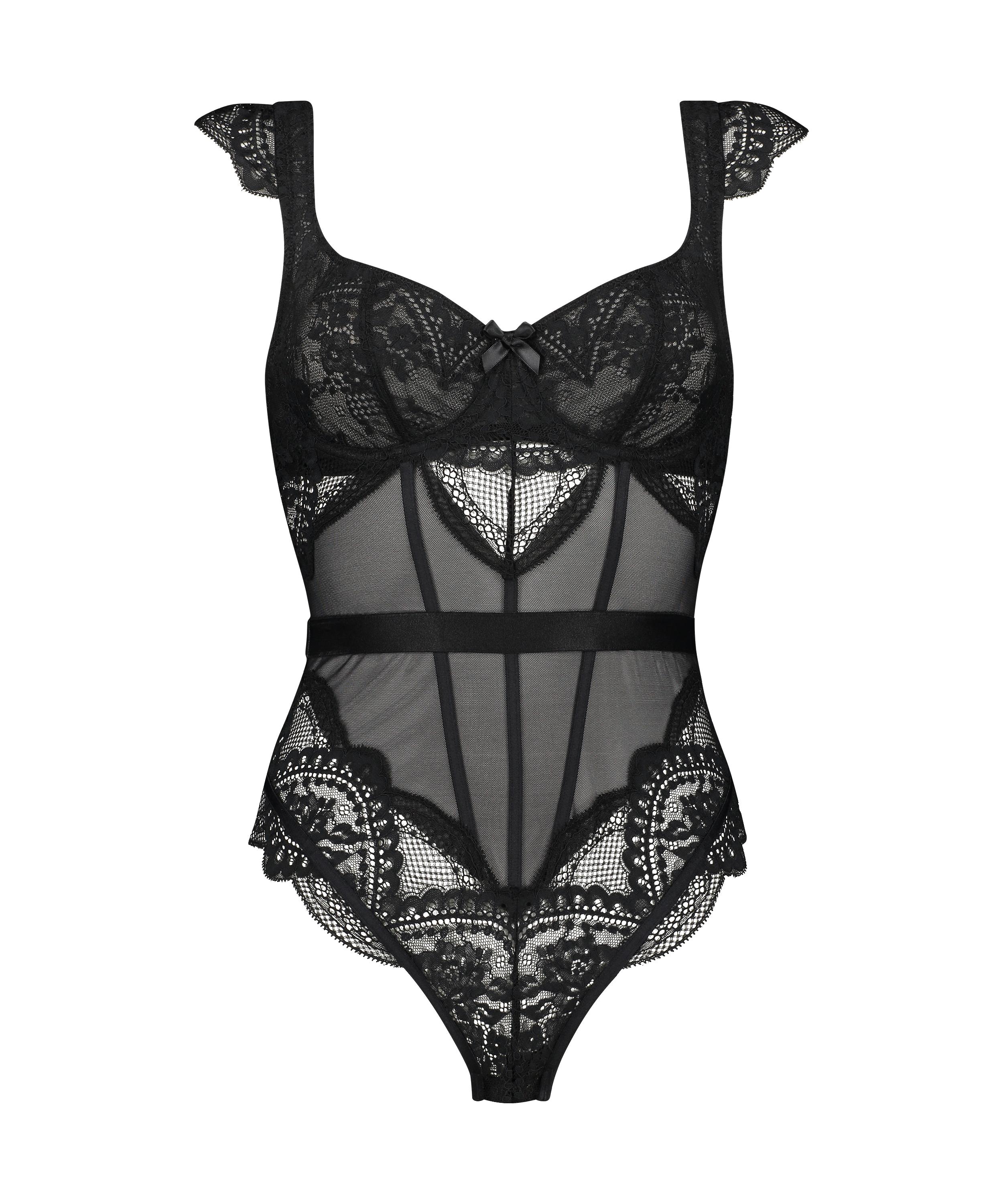 This body is super elegant! With lots of lace running over the shoulders and a stud closure at the crotch. With lovely detailing too. Combine with other matching items for a complete look. Part of the Rebecca Mir Collection.
