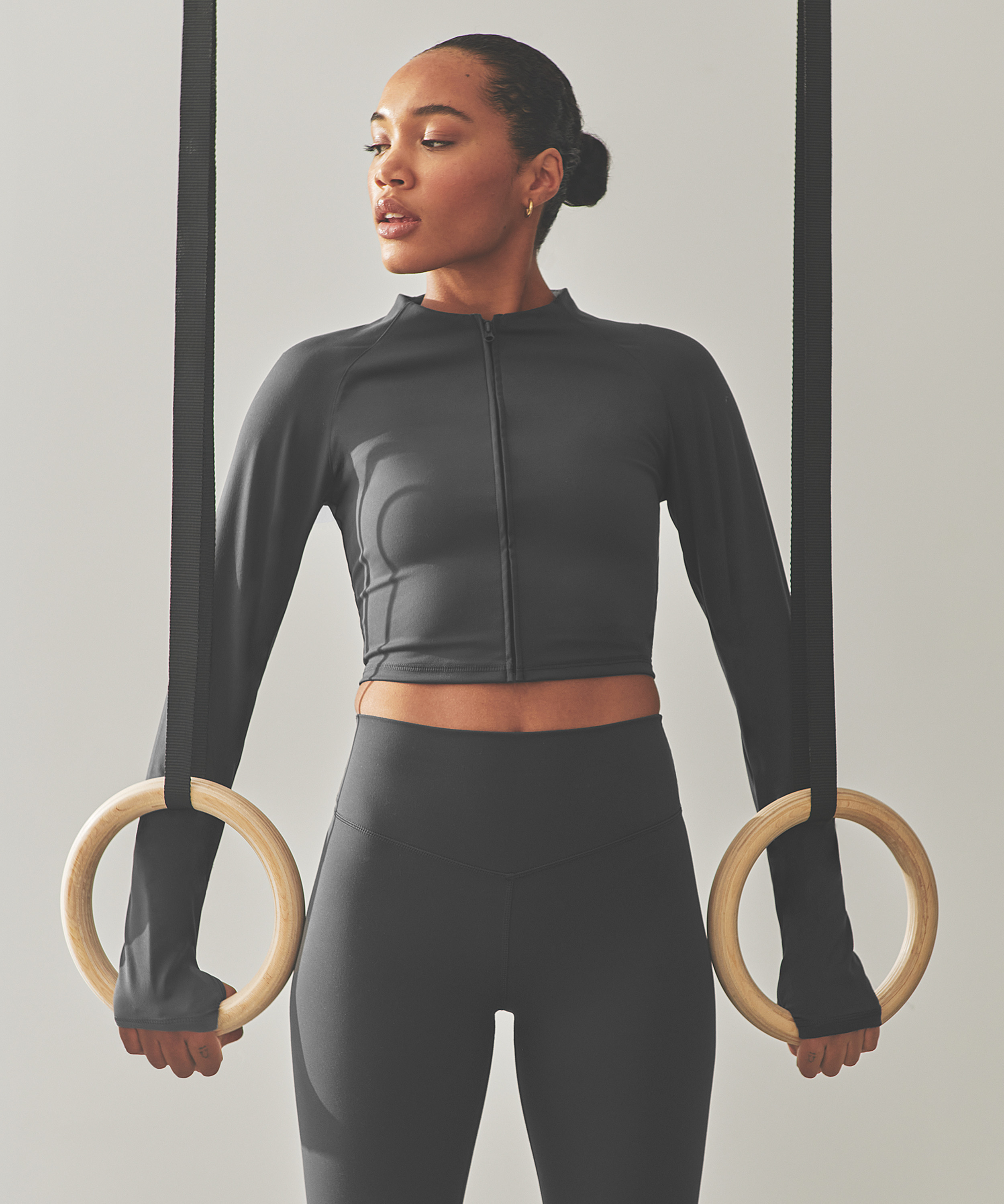 This jacket is perfect for working out! The jacket has a zip closure and holes in the sleeves to put your thumbs through. Combine with matching items.