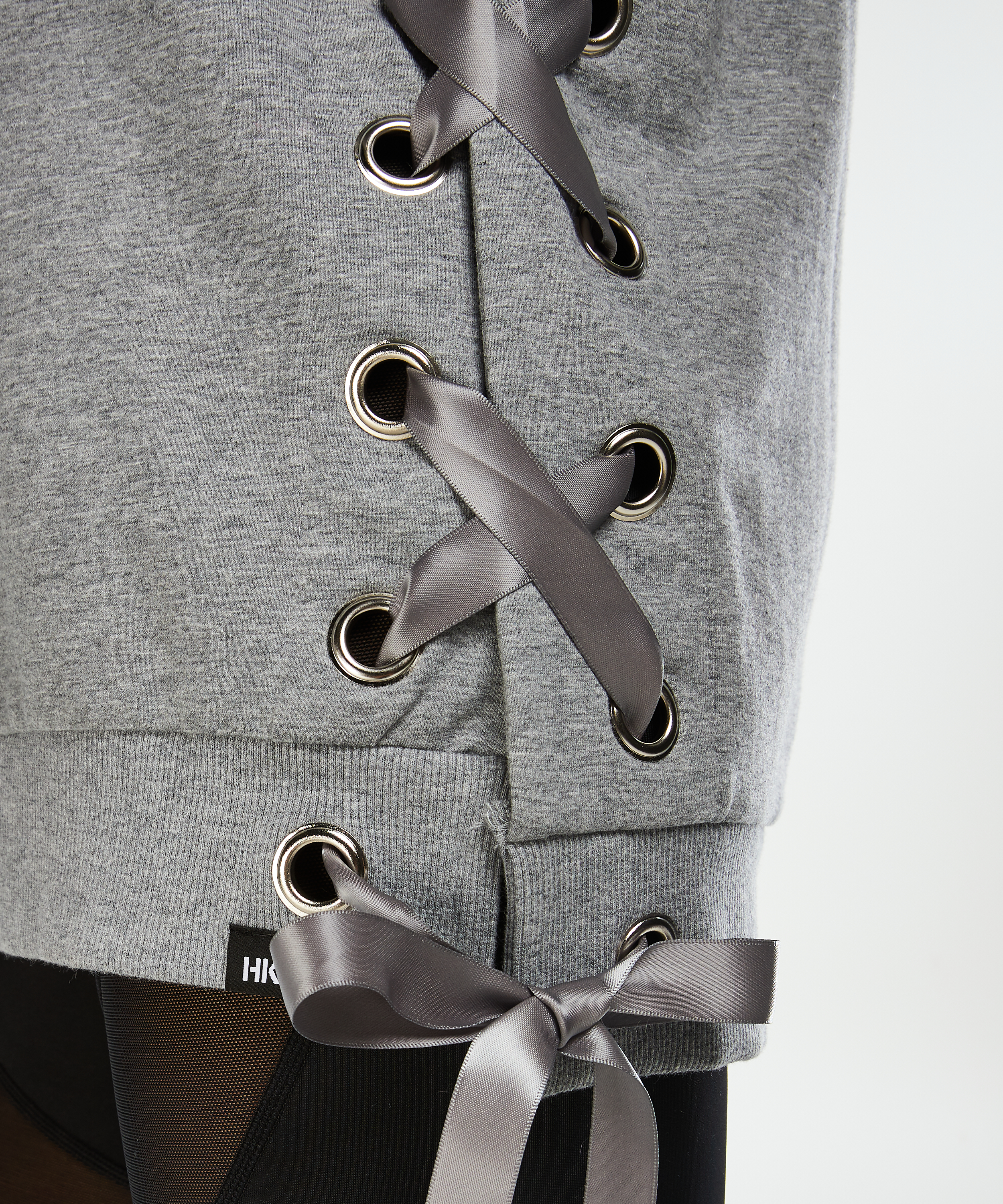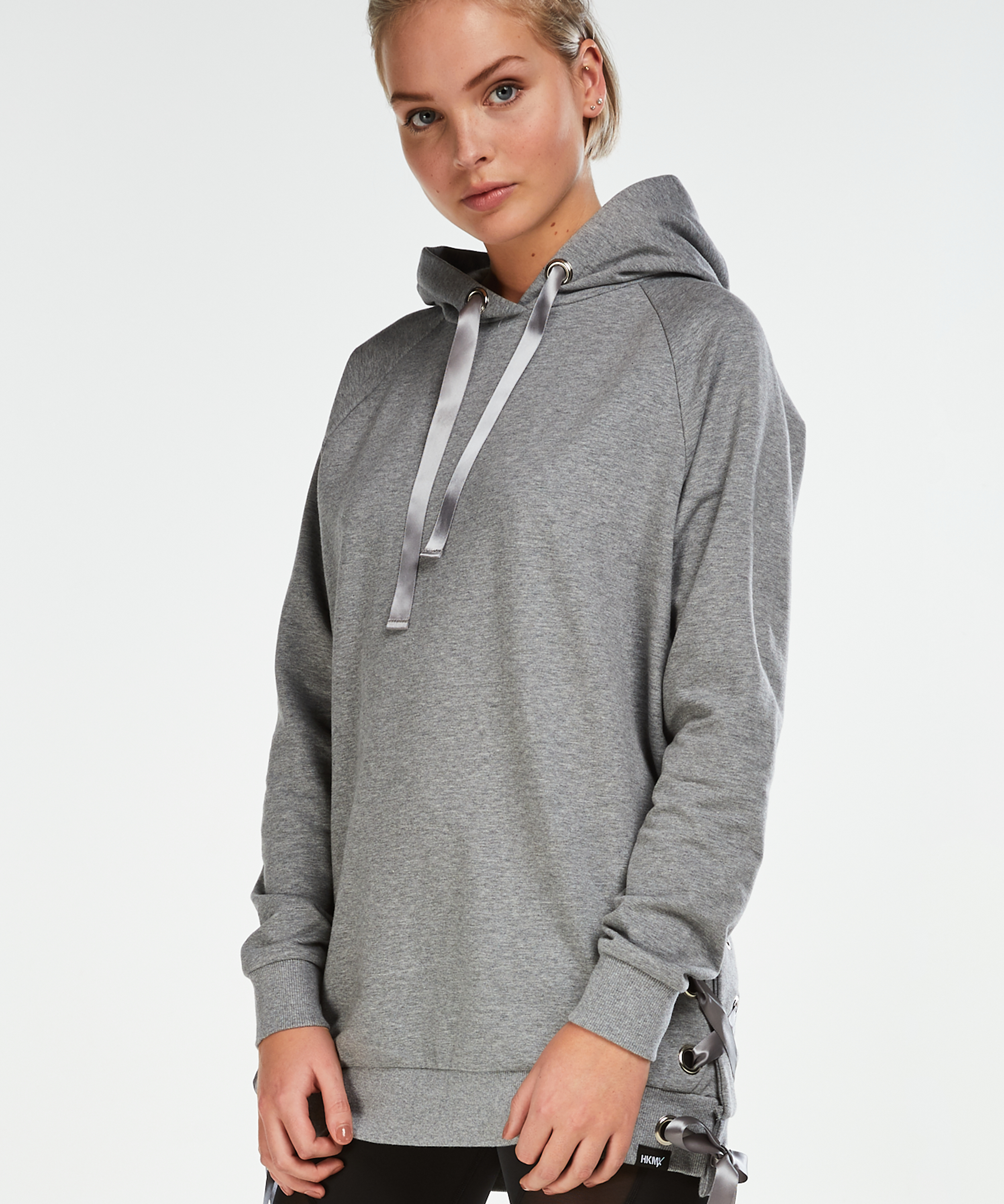 This sporty sweater is perfect before or after your work-out! The sweater has a hood. Along the bottom there are lace-up details which give the sweater a fashionable look!