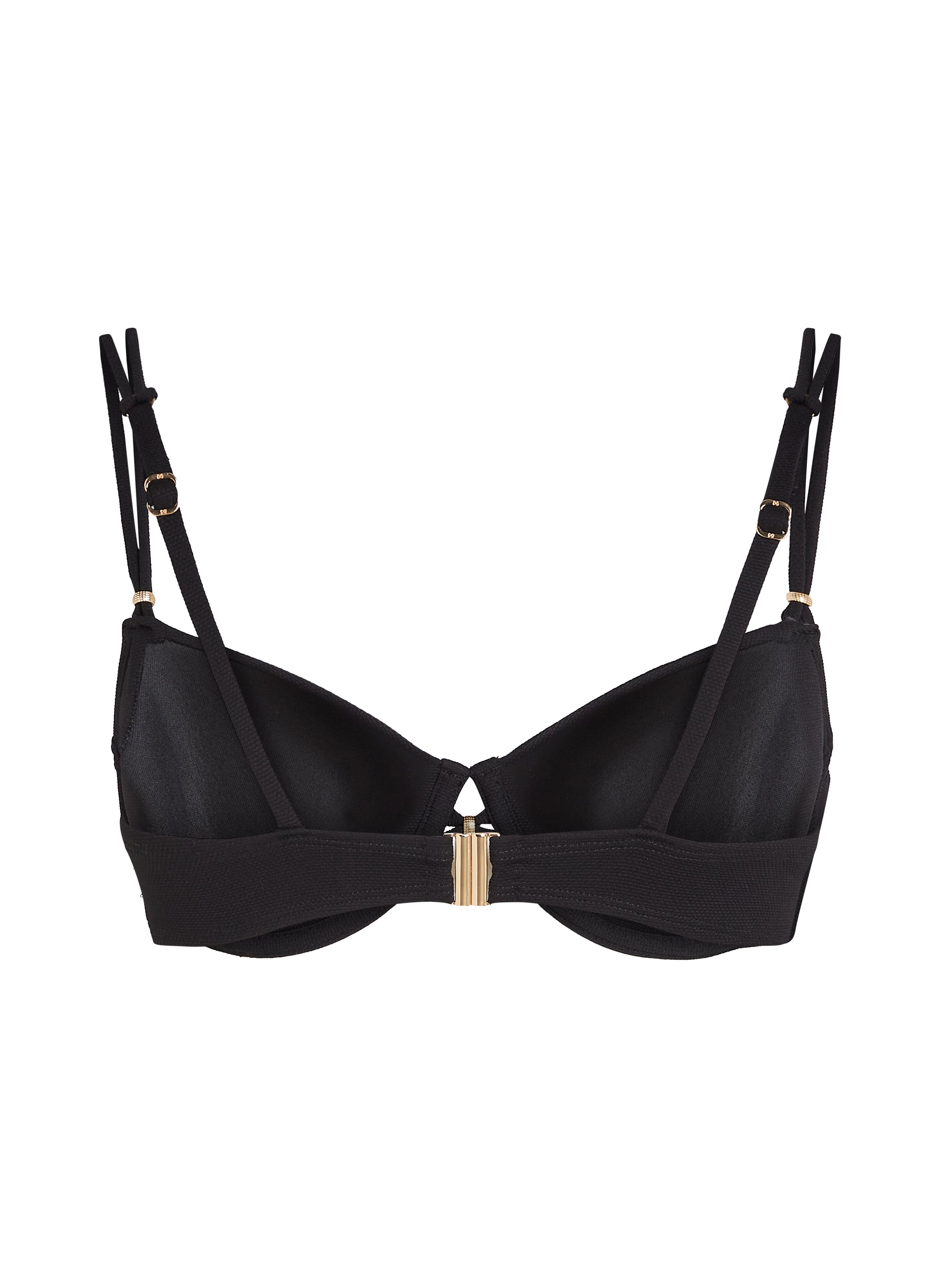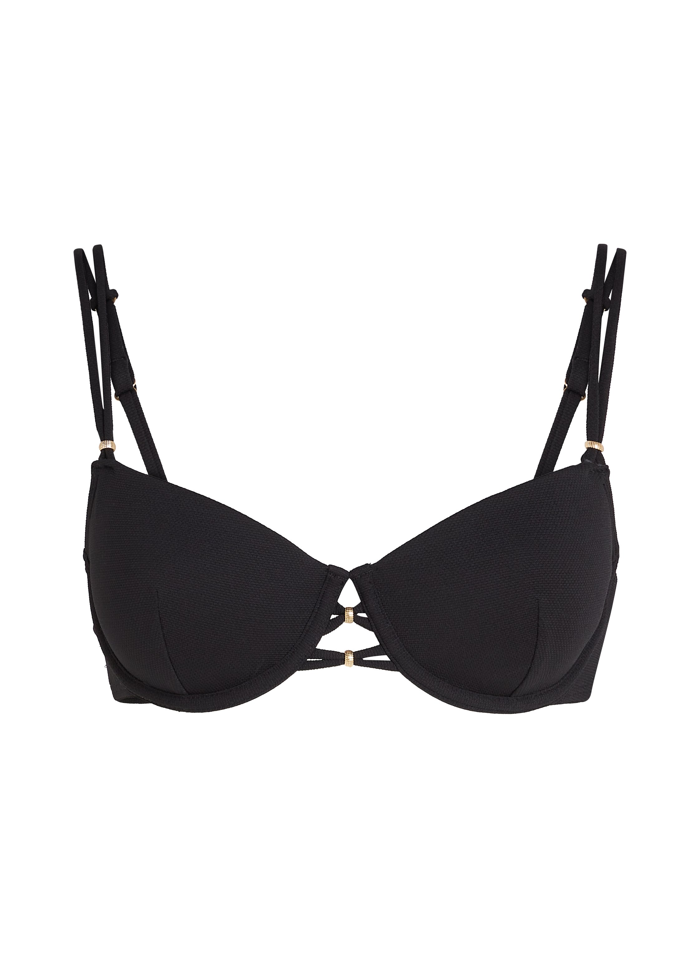 Make a splash at the beach with our stylish bikini top! Featuring underwire support and a chic strappy design between the cups adorned with beads, this piece offers both style and comfort. It also boasts adjustable shoulder straps and a convenient clip closure in the back for a secure fit. Pair it with your favorite bottoms and get ready to soak up the sun in style!Our swimwear is developed with high quality fabrics and linings to deliver a supportive fit. If you want a more relaxed fit, we recommend that you size up.
