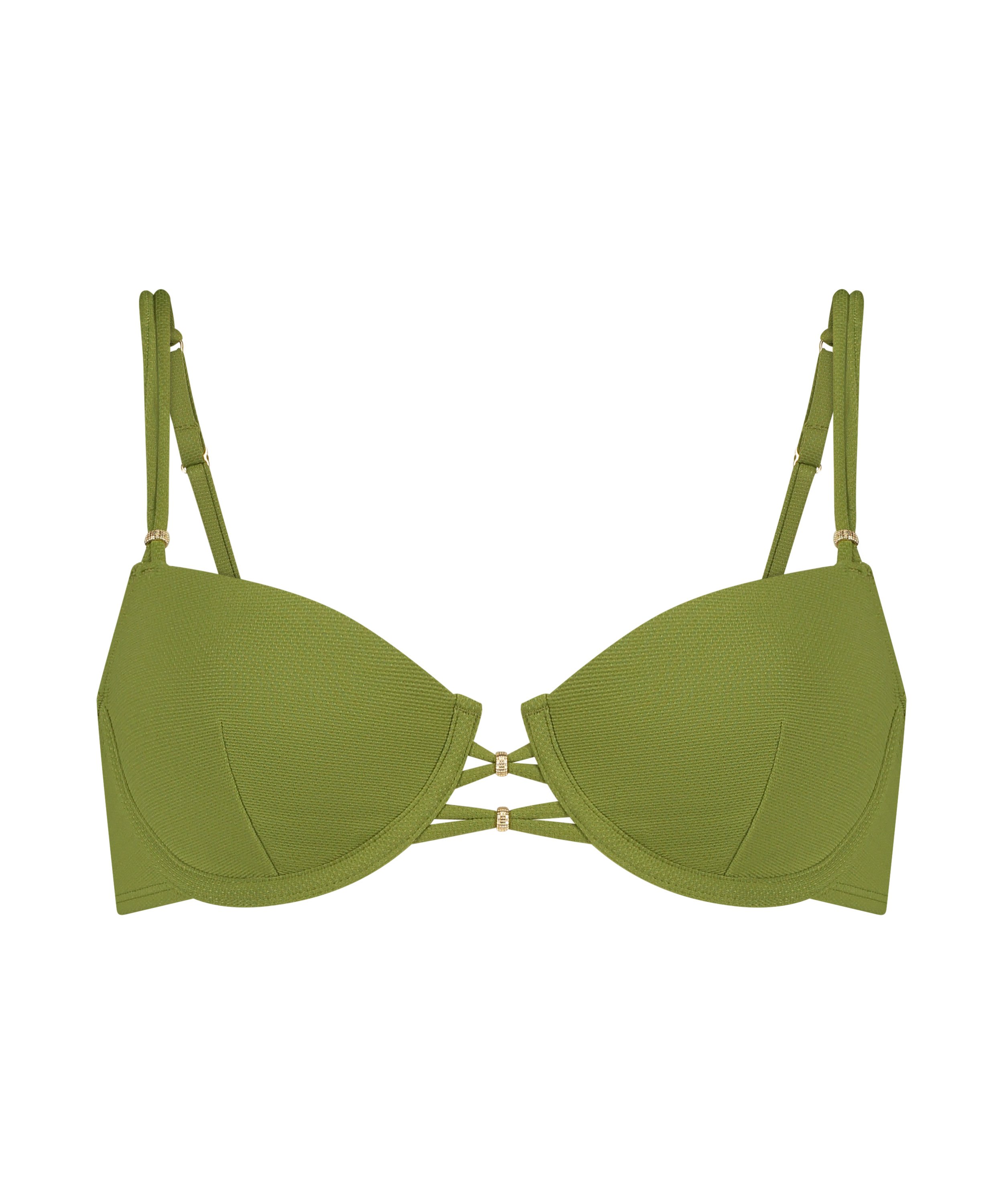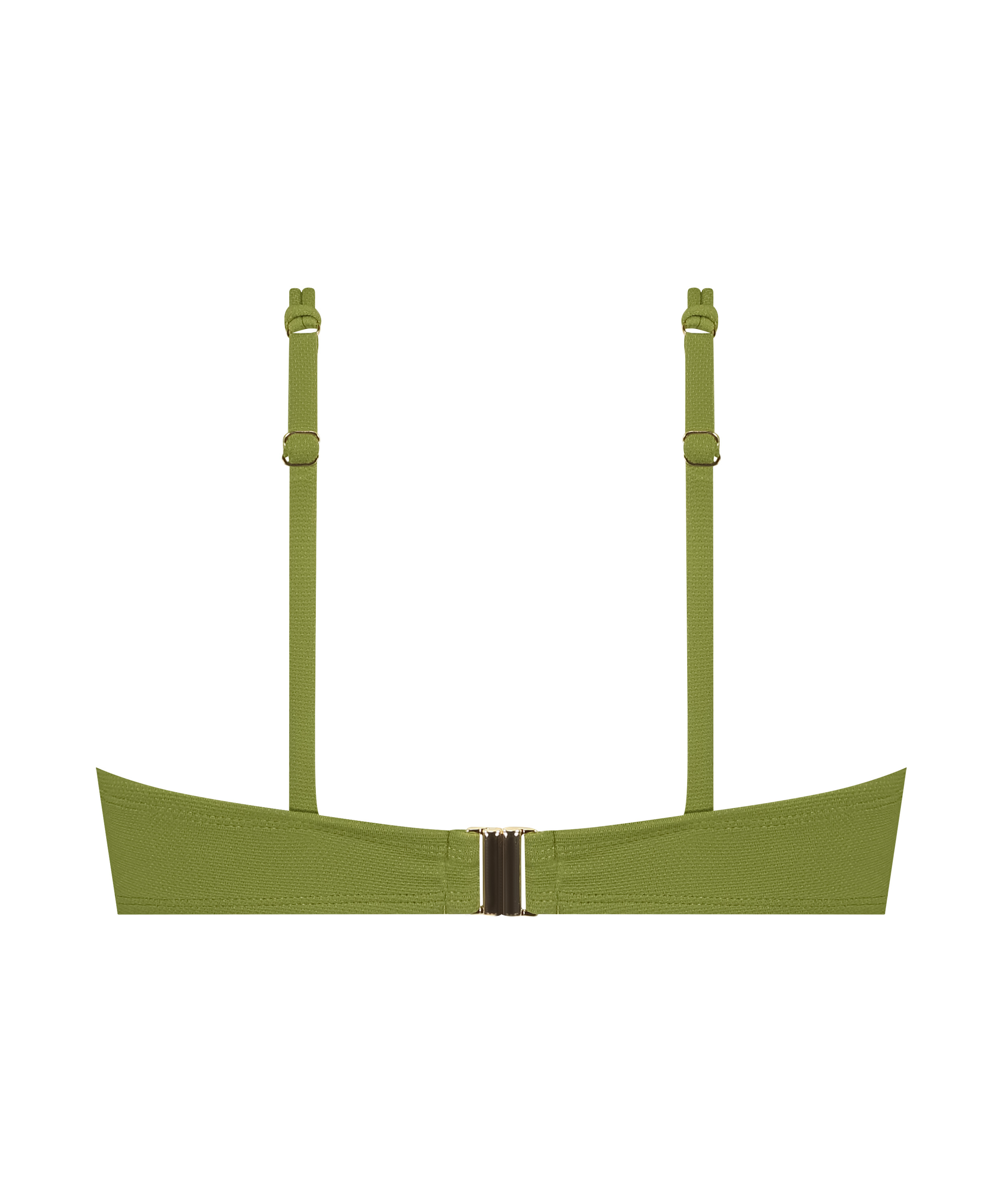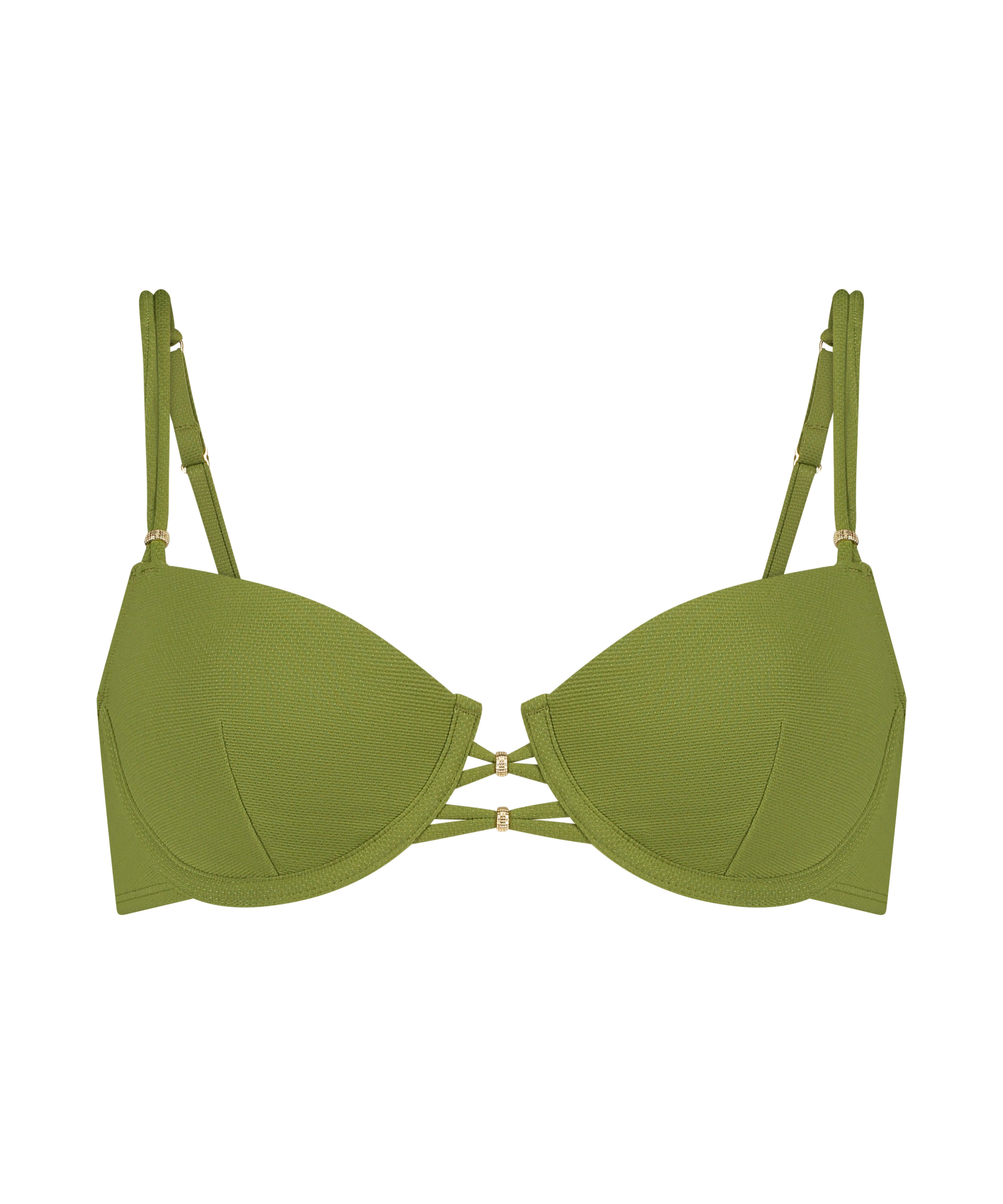 Make a splash at the beach with our stylish bikini top! Featuring underwire support and a chic strappy design between the cups adorned with beads, this piece offers both style and comfort. It also boasts adjustable shoulder straps and a convenient clip closure in the back for a secure fit. Pair it with your favorite bottoms and get ready to soak up the sun in style!Our swimwear is developed with high quality fabrics and linings to deliver a supportive fit. If you want a more relaxed fit, we recommend that you size up.