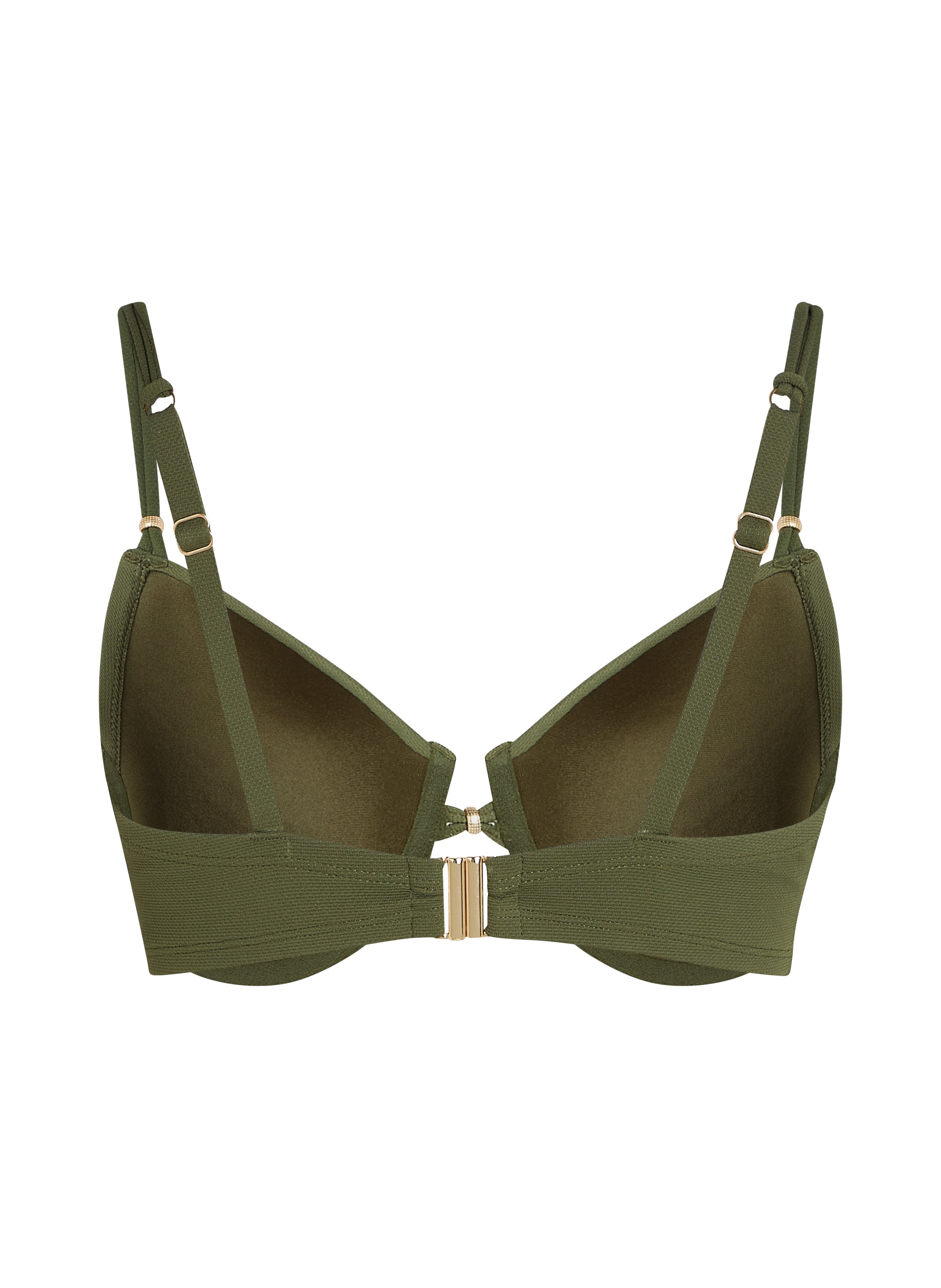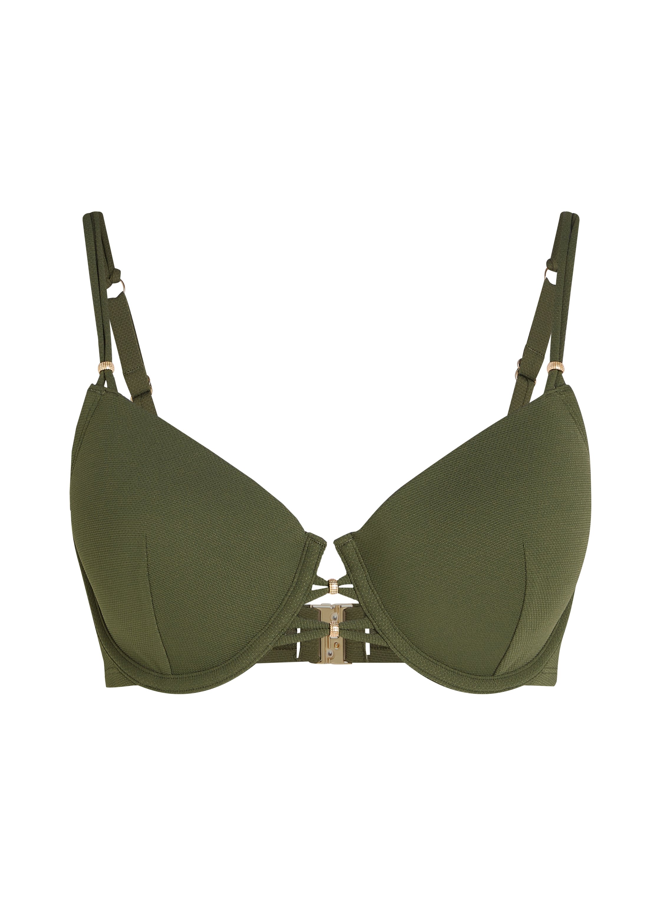 Make a splash at the beach with our stylish bikini top! Featuring underwire support and a chic strappy design between the cups adorned with beads, this piece offers both style and comfort. It also boasts adjustable shoulder straps and a convenient clip closure in the back for a secure fit. Pair it with your favorite bottoms and get ready to soak up the sun in style!Our swimwear is developed with high quality fabrics and linings to deliver a supportive fit. If you want a more relaxed fit, we recommend that you size up.
