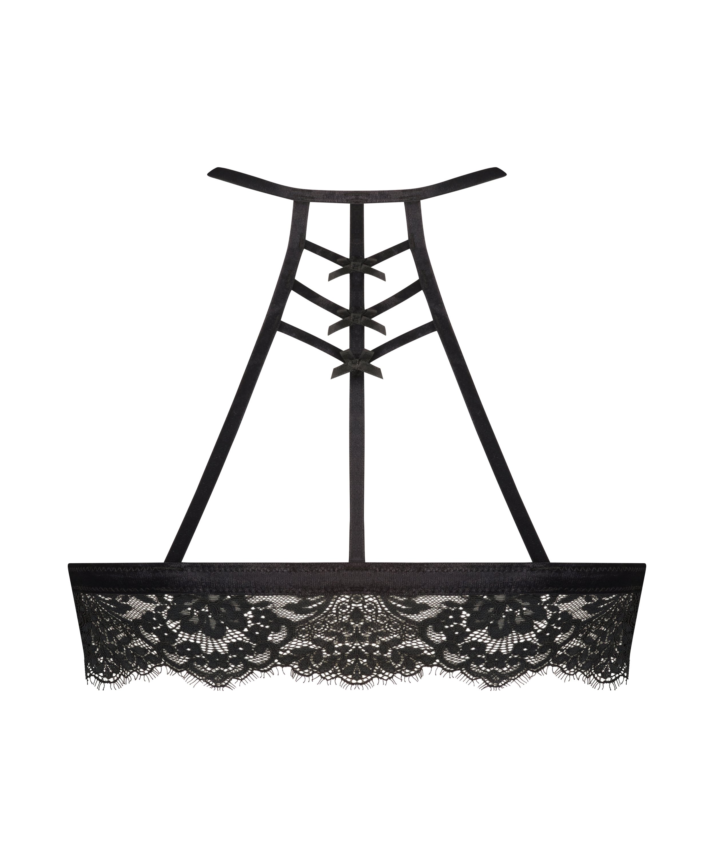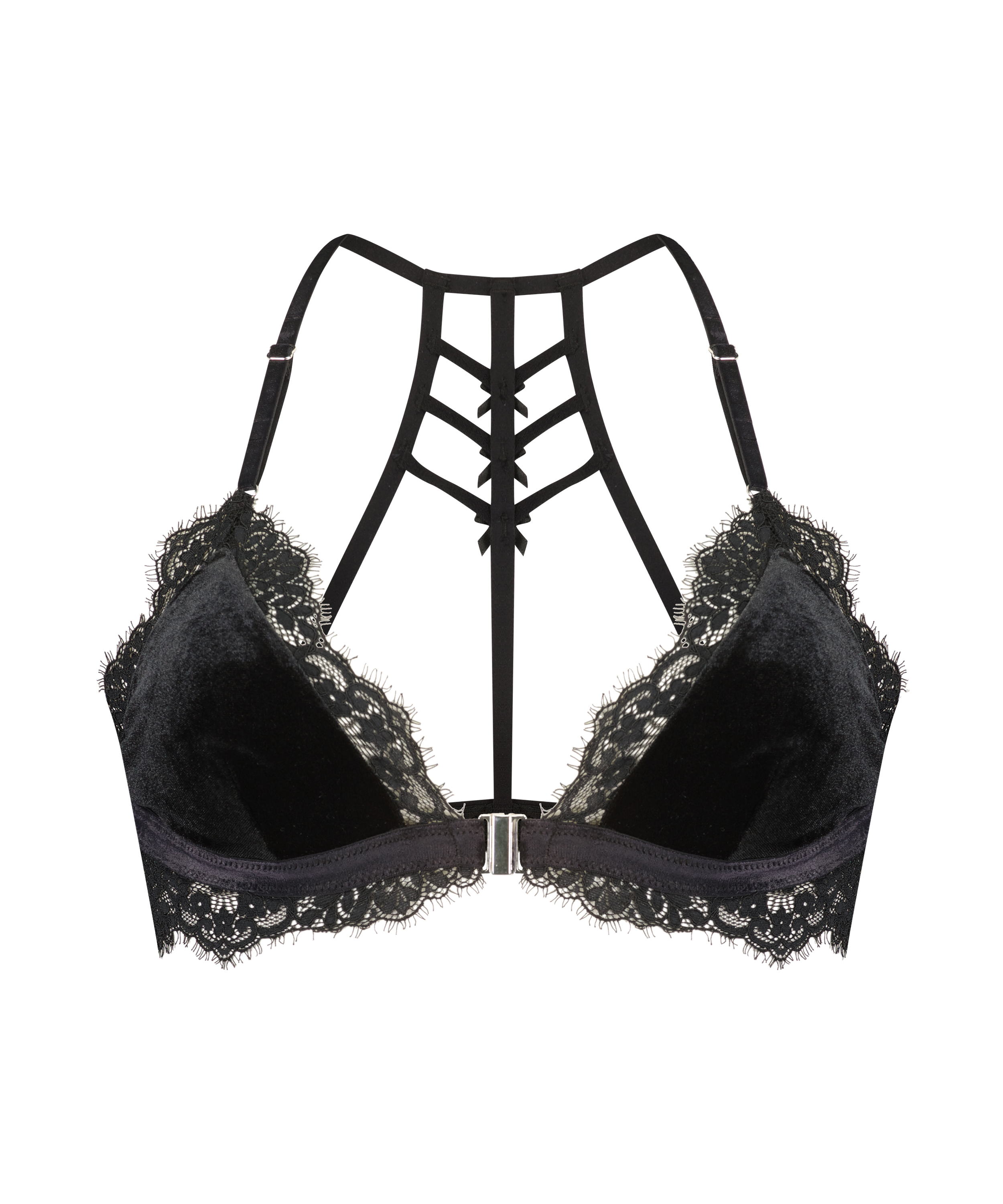 This lovely, elegant bralette is a must-have for your wardrobe! It has cute bows and strappy detailing, and the back is trimmed in luscious lace. Fastens on the front. Combine with matching knickers for a complete set.
