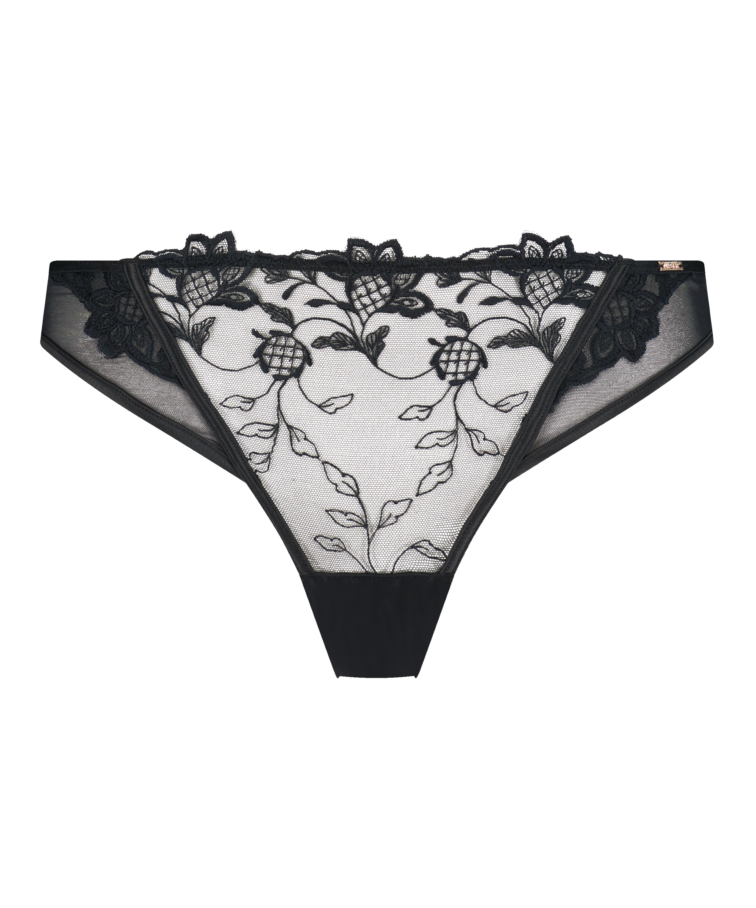Feel elegant in this stunning thong! With an all-over semi-transparent sexy look with embroiders, lace, and mesh details on the front and back. Combine with the matching bra to finish the set! Part of our Noir collection.